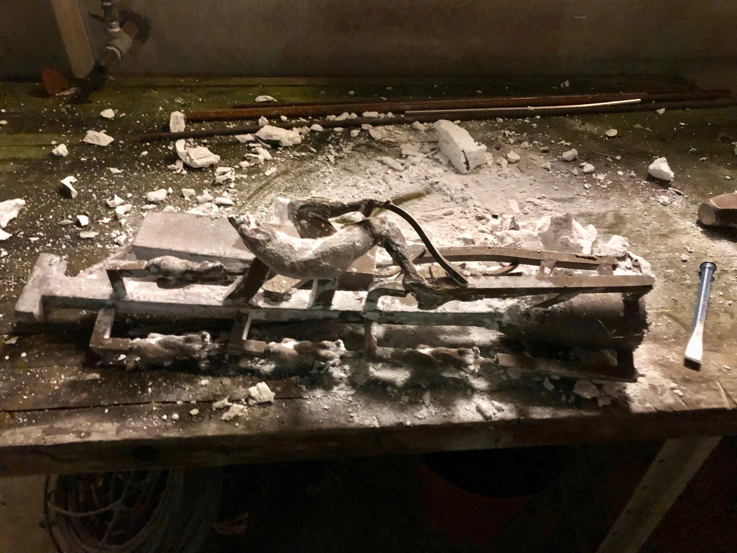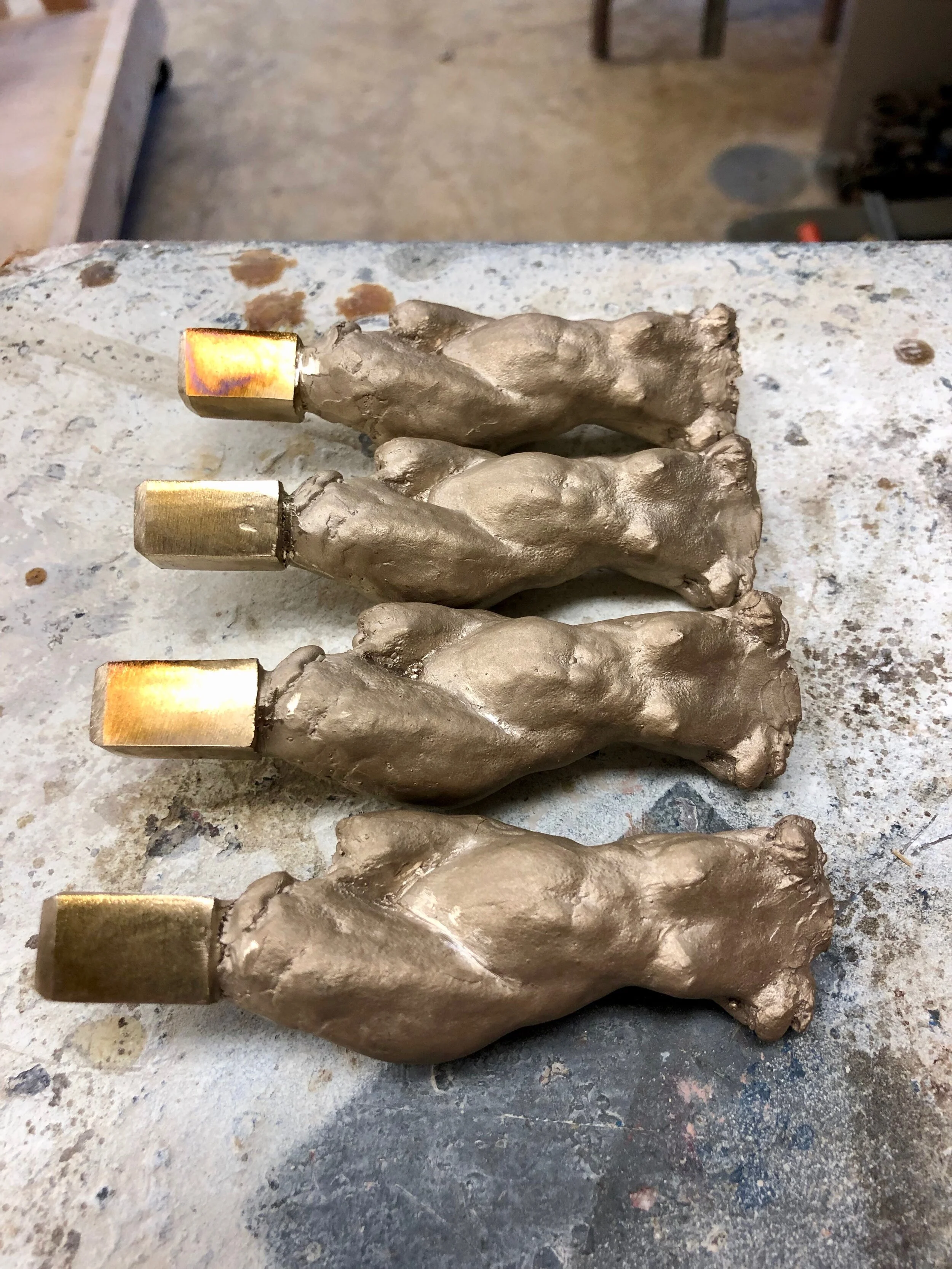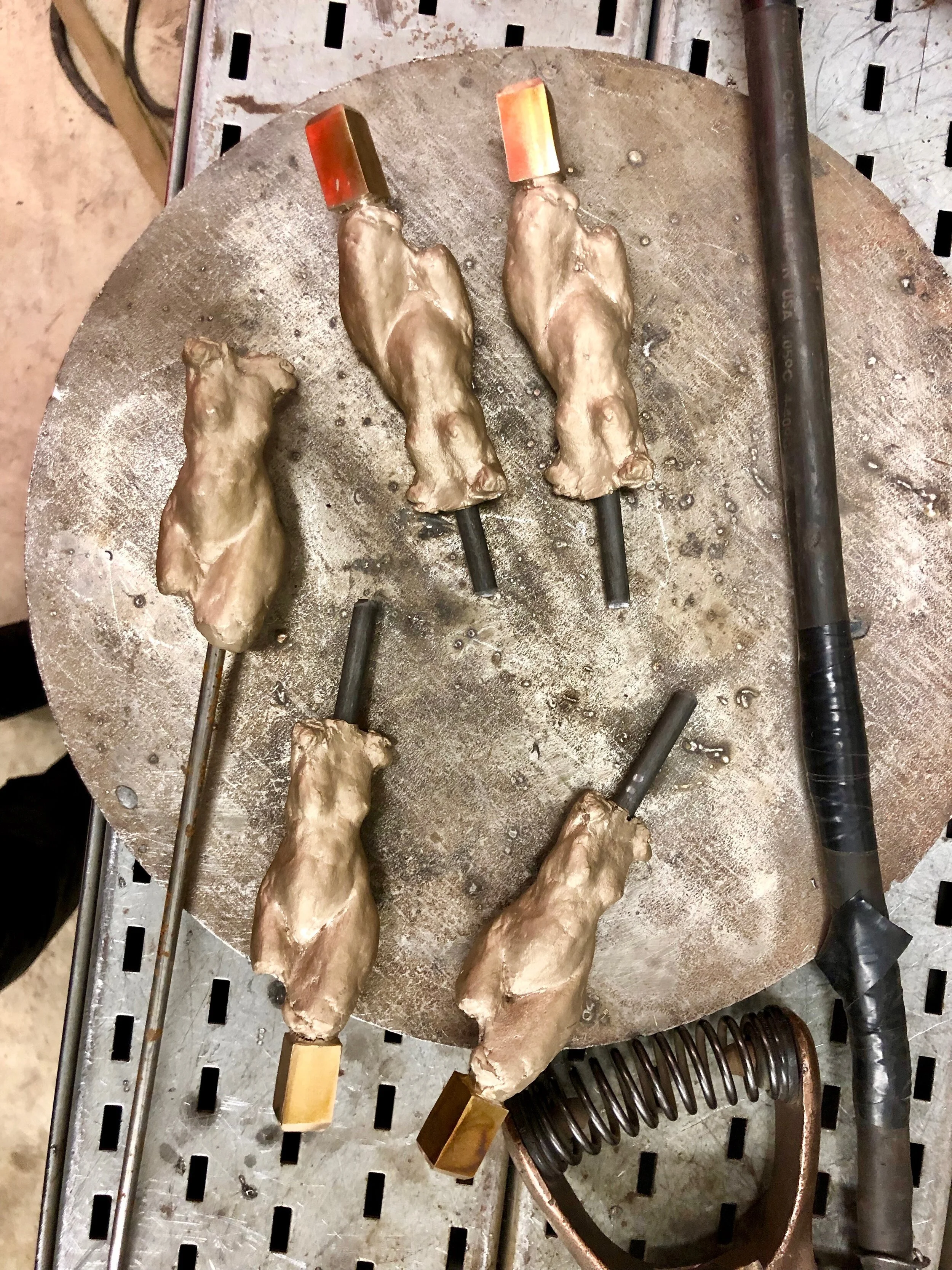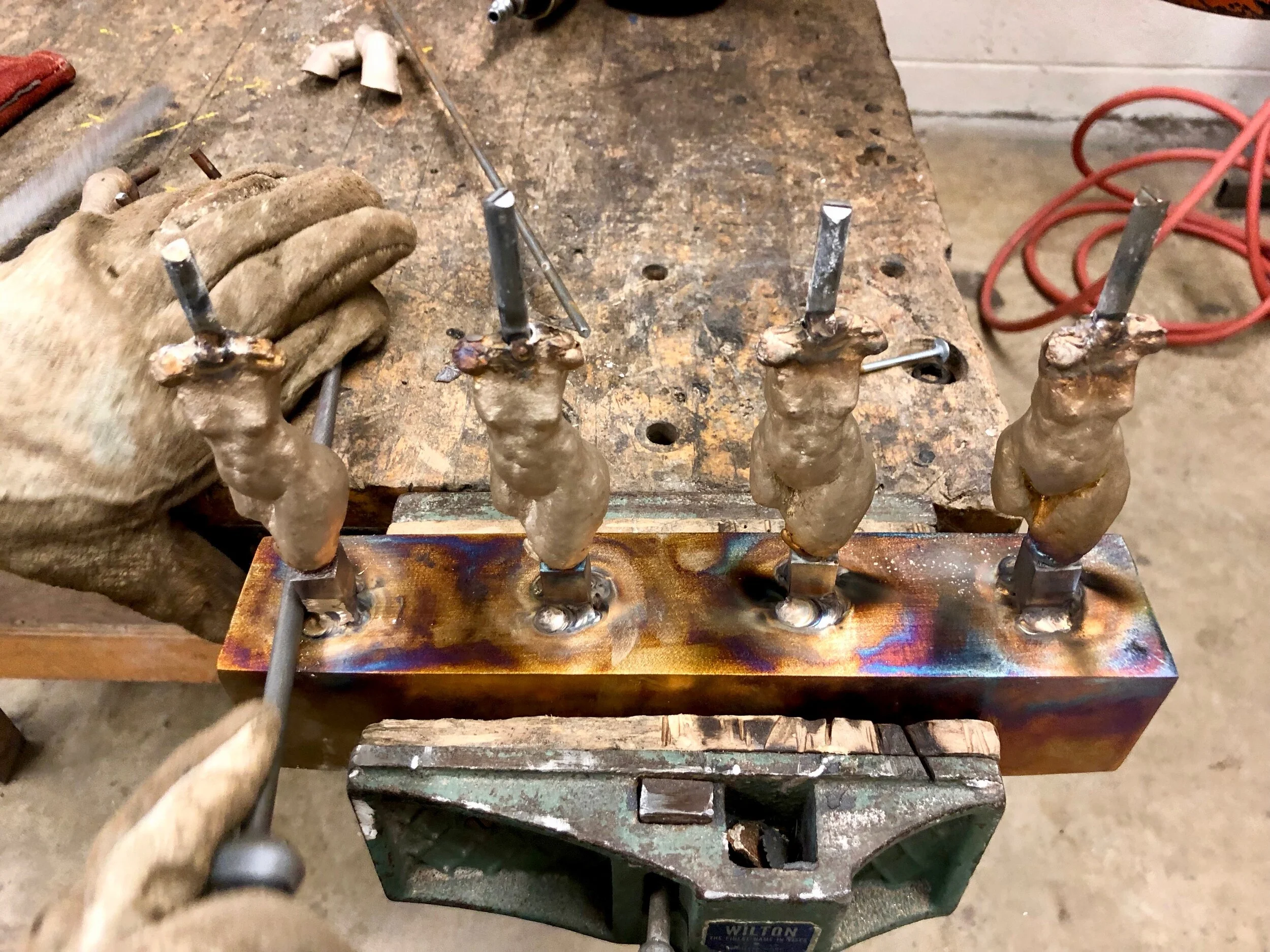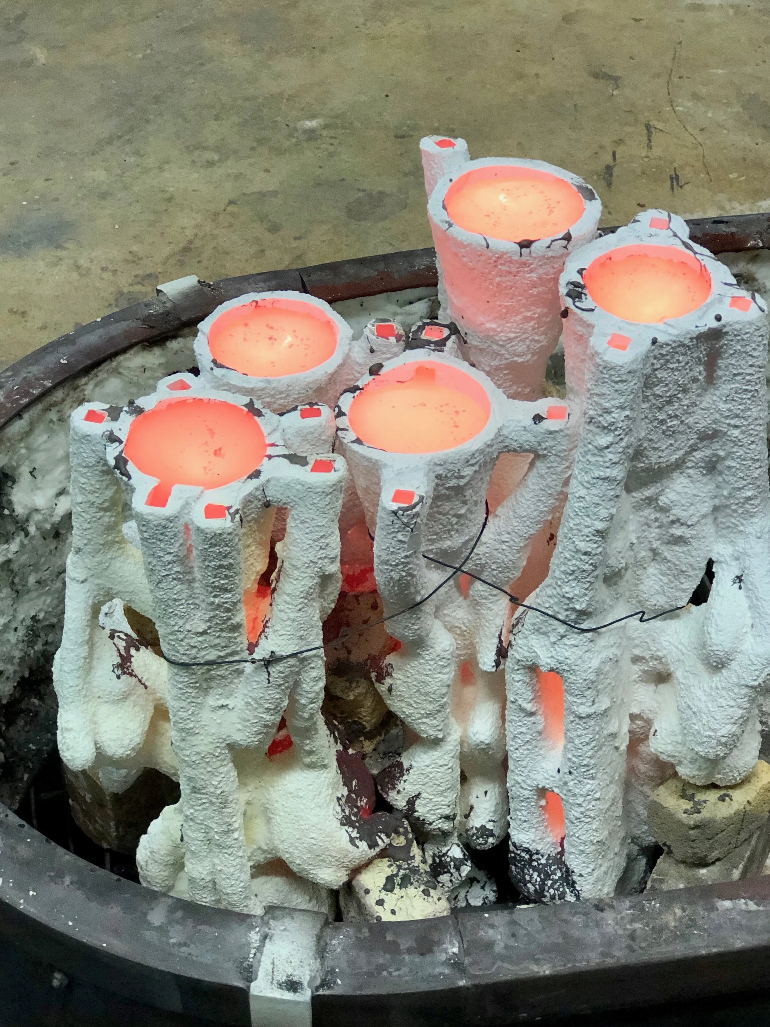 Sprue systems are dipped in silica slurry and covered in silica grit over a period of days, building up the silica to form a shell around the wax. This system is then fired, melting out the wax and producing a hard ceramic shell mould. The shells are then filled with molten bronze and left to cool. Once cool, the ceramic shells are removed from the cast bronze with chisels, hammers and sandblasters. The sculptures are then cut from the remaining bronze sprue system and are chased with metal working tools to hide signs of the sprue system and to fix blemishes. When sculptures have been chased and assembled to the satisfaction of the artist, they are finished with a patina which is made from layering chemicals on the surface of the bronze at different temperatures.