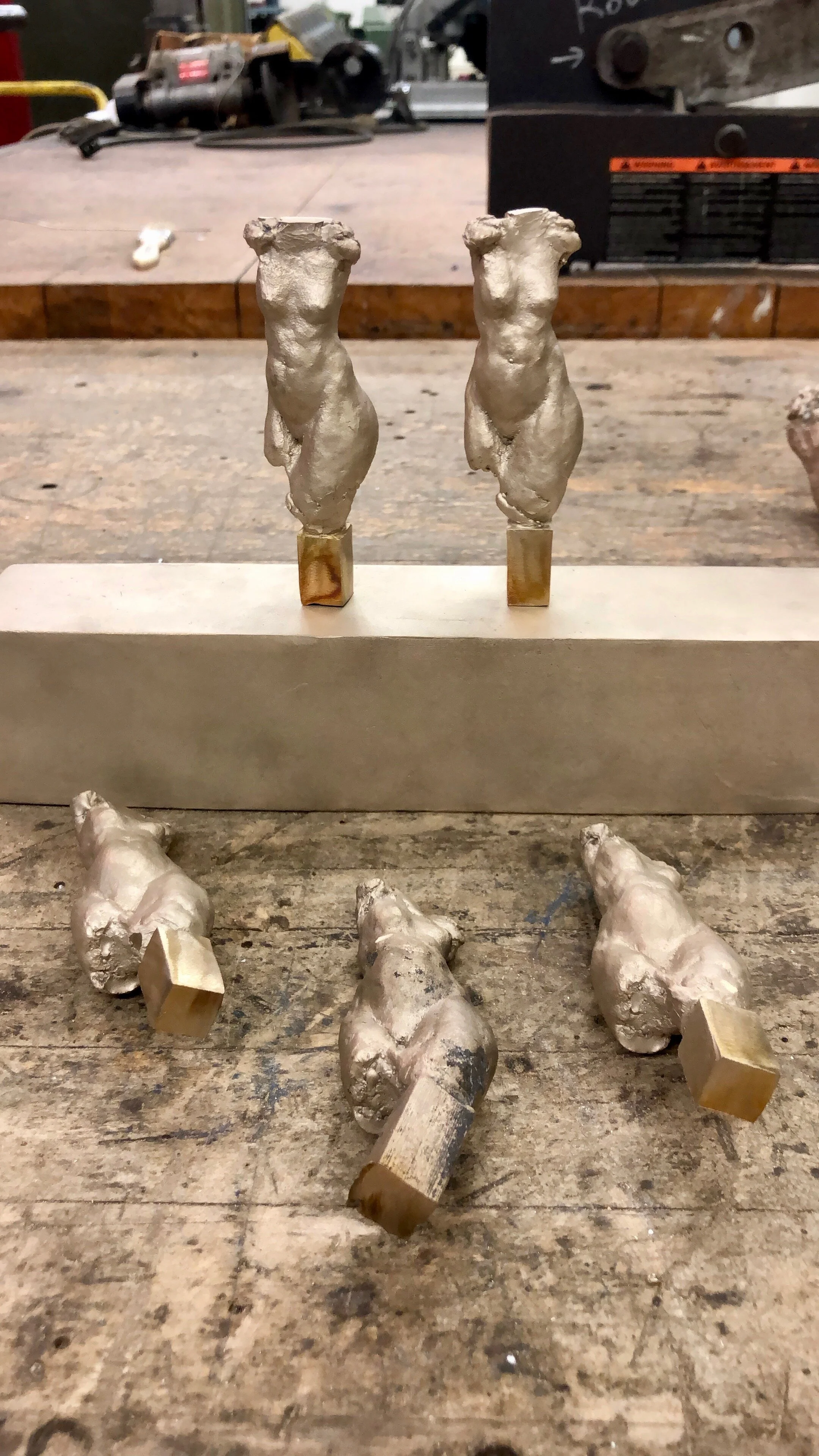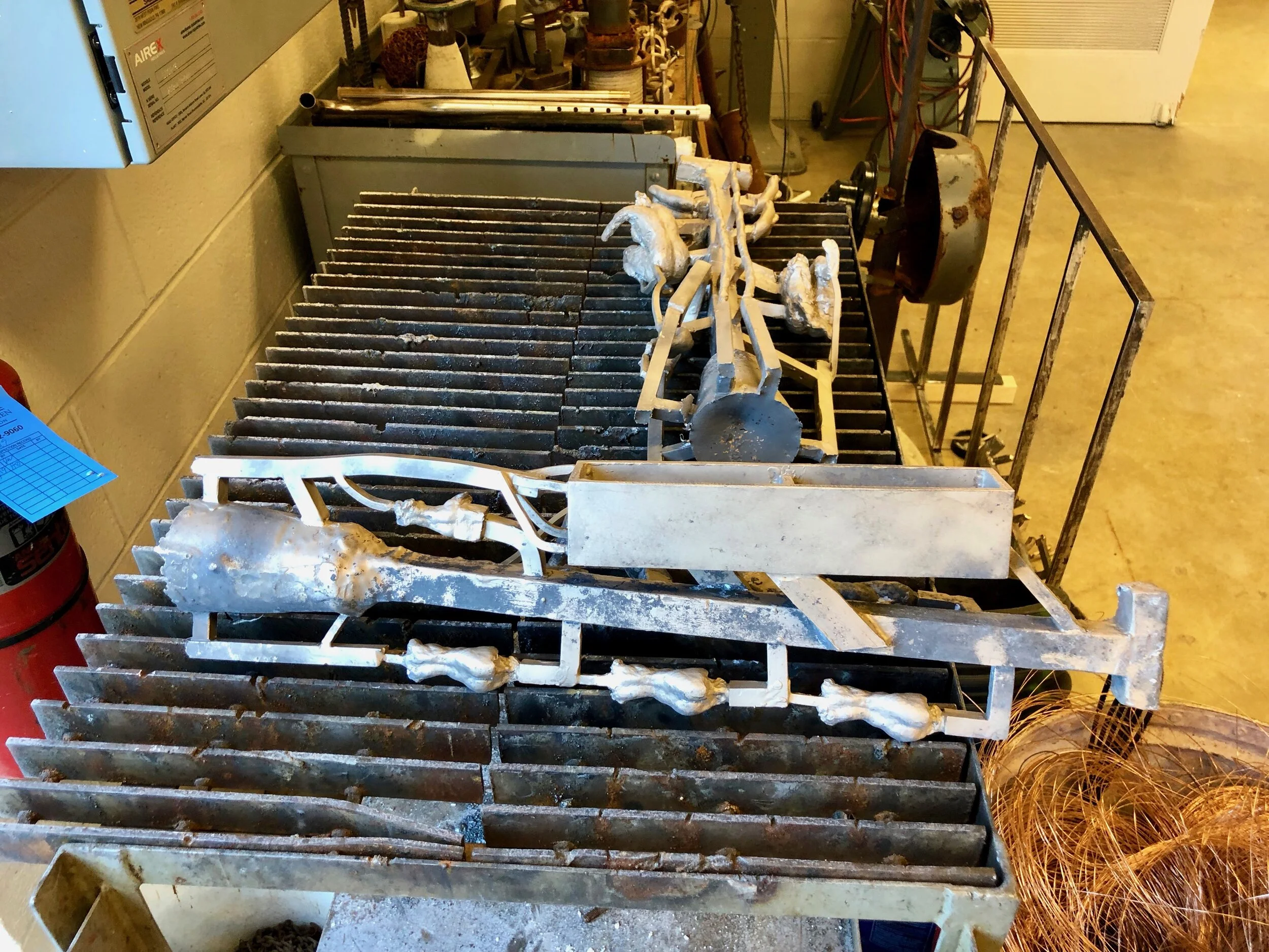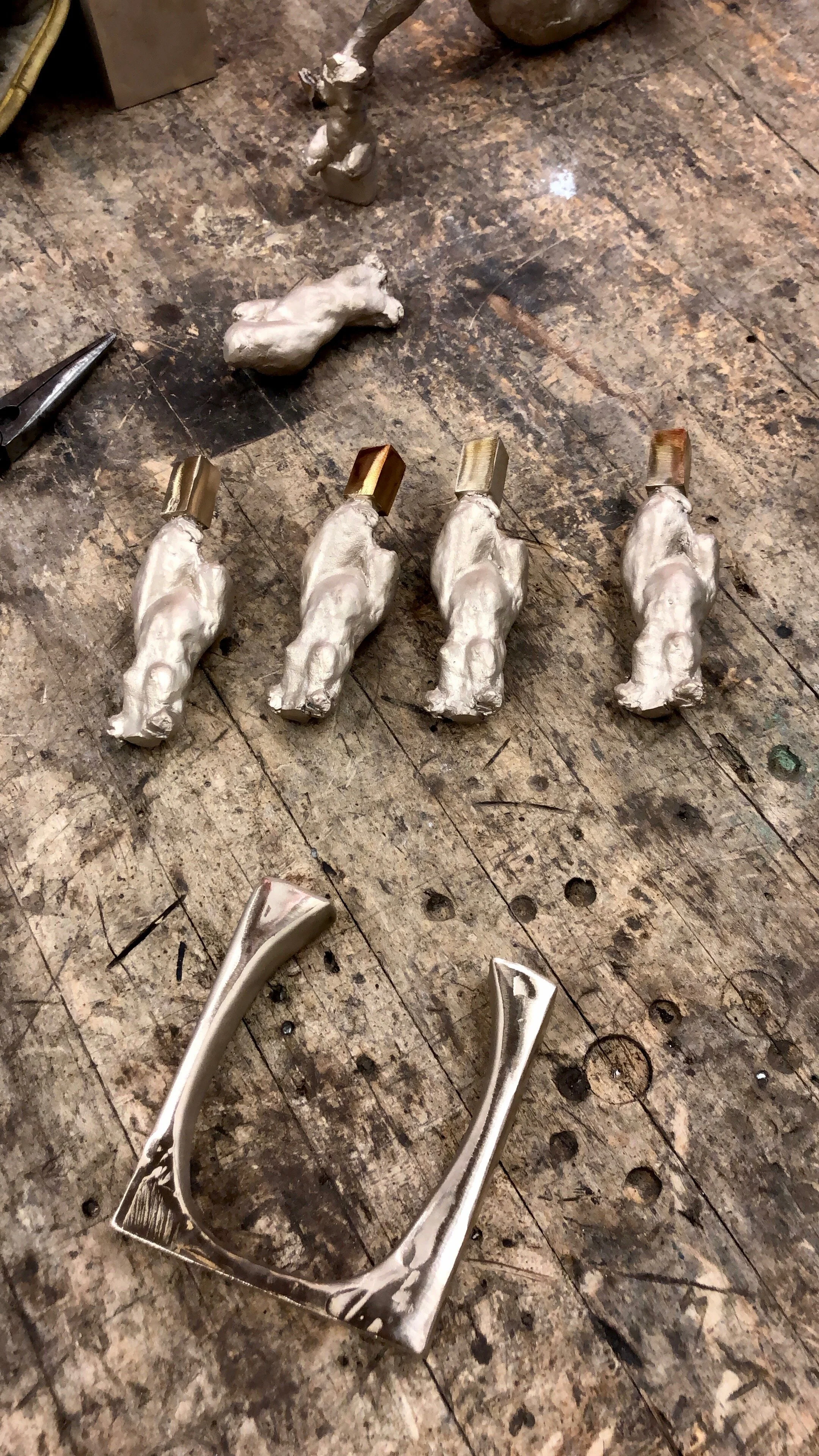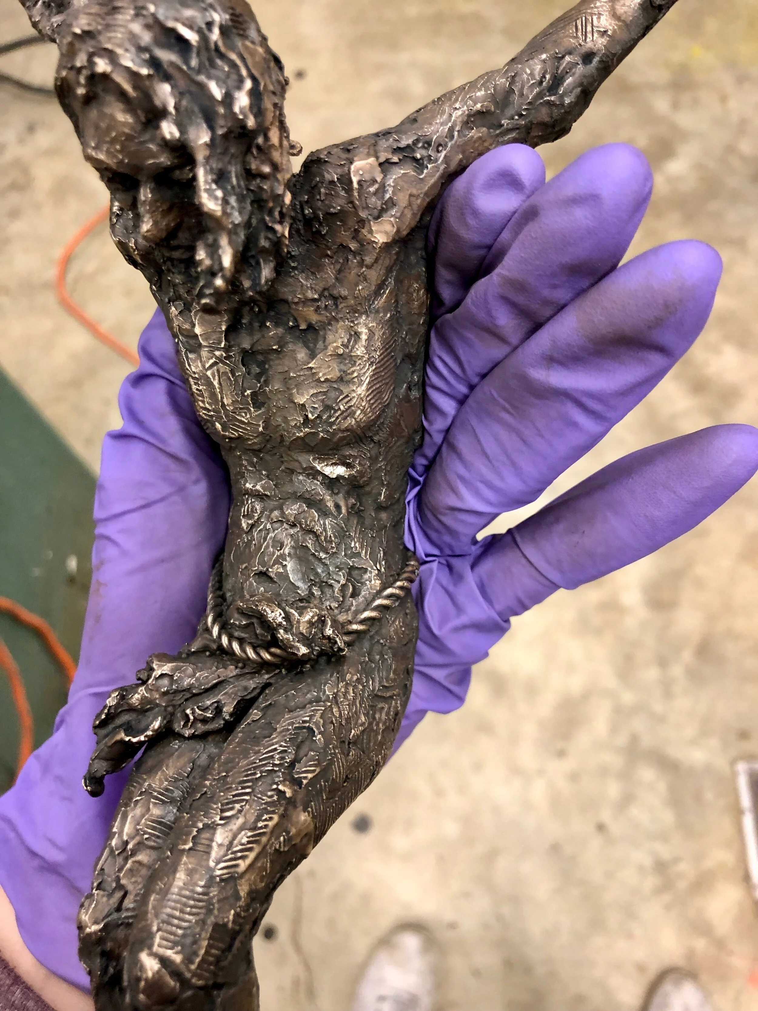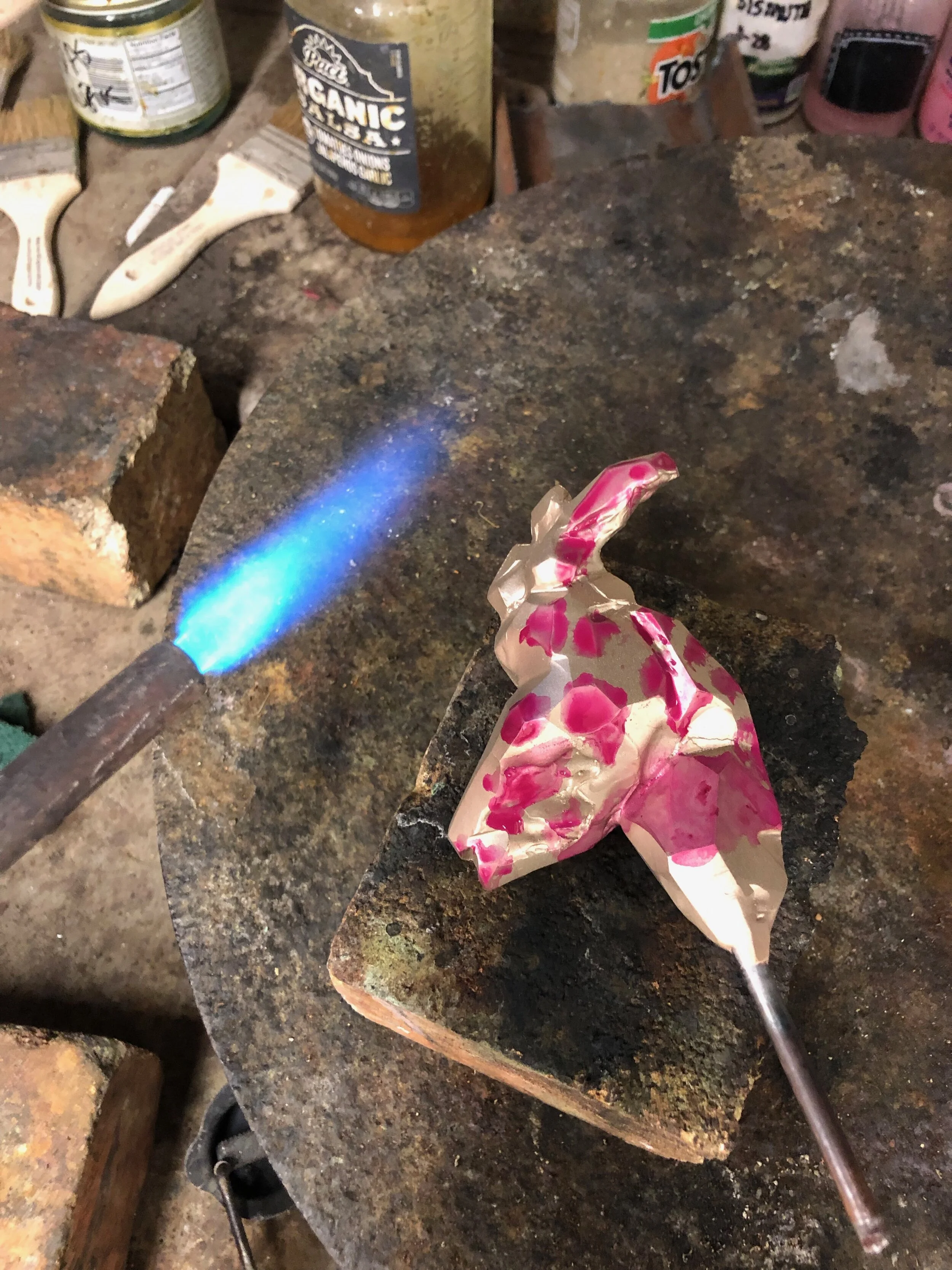 Sprue systems are dipped in silica slurry and covered in silica grit over a period of days, building up the silica to form a shell around the wax. This system is then fired, melting out the wax and producing a hard ceramic shell mould. The shells are then filled with molten bronze and left to cool. Once cool, the ceramic shells are removed from the cast bronze with chisels, hammers and sandblasters. The sculptures are then cut from the remaining bronze sprue system and are chased with metal working tools to hide signs of the sprue system and to fix blemishes. When sculptures have been chased and assembled to the satisfaction of the artist, they are finished with a patina which is made from layering chemicals on the surface of the bronze at different temperatures.
