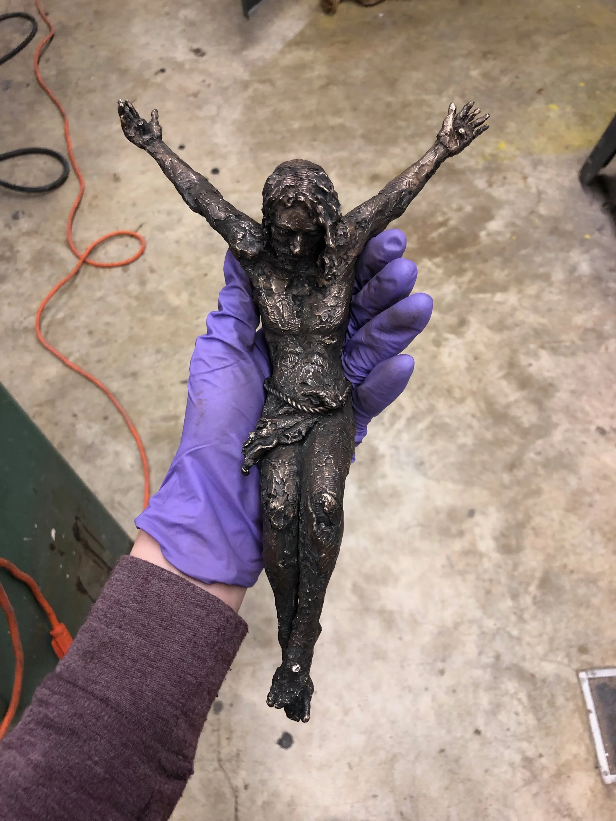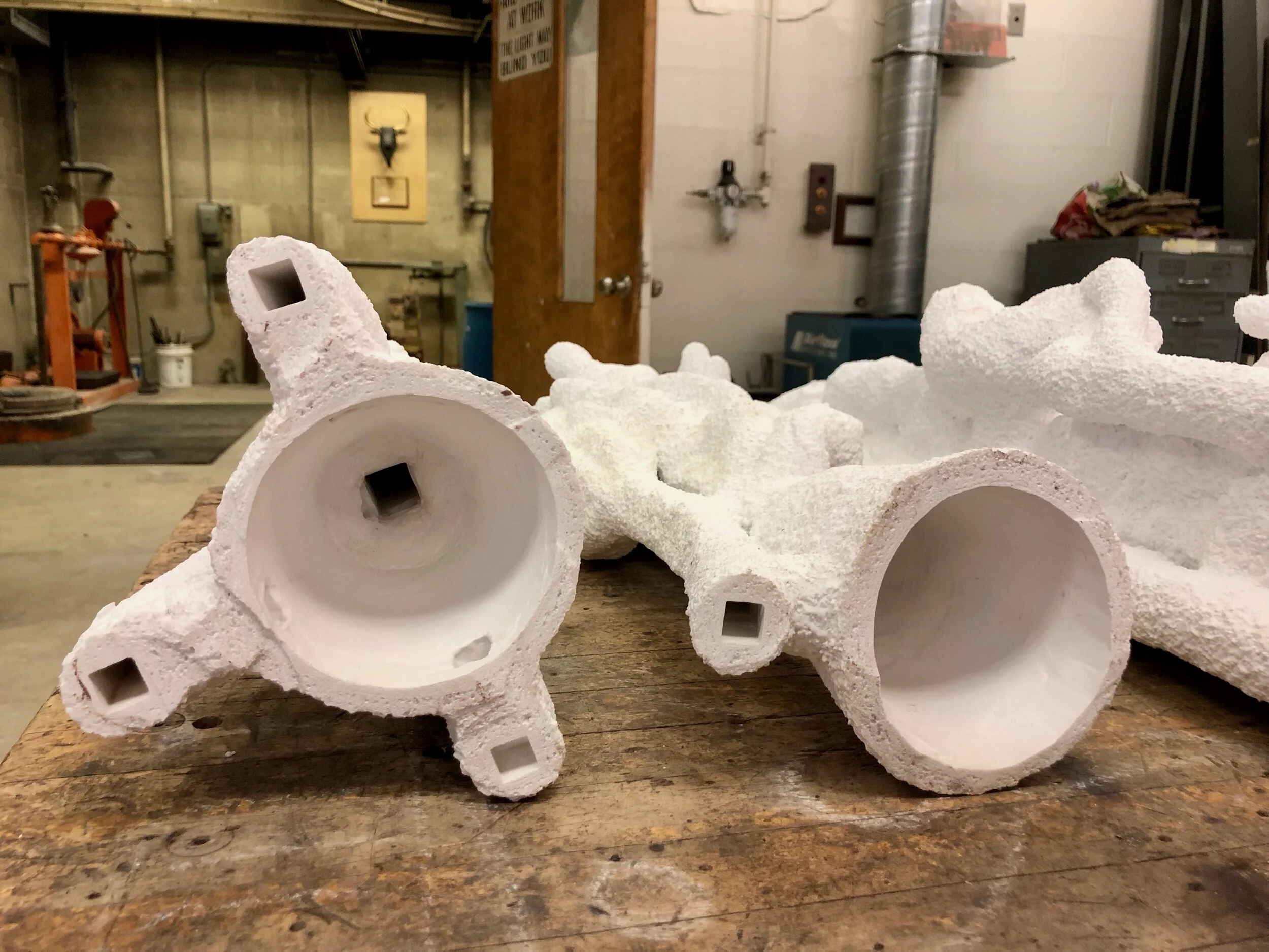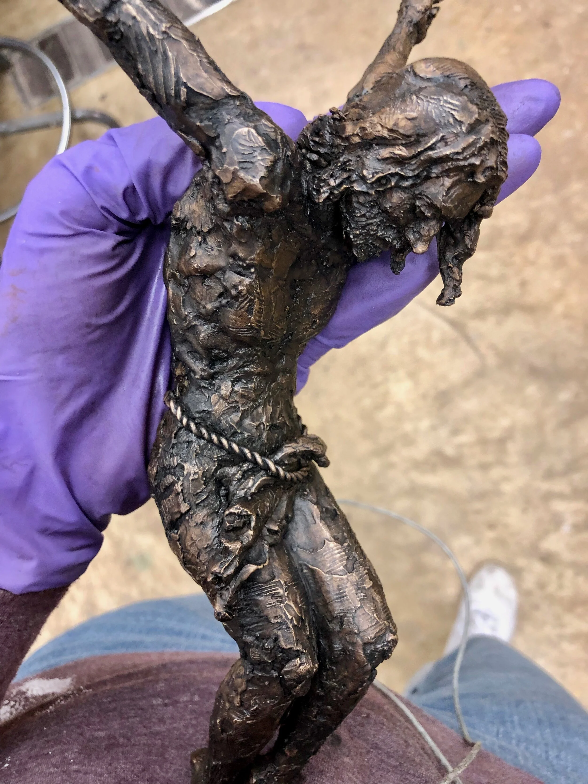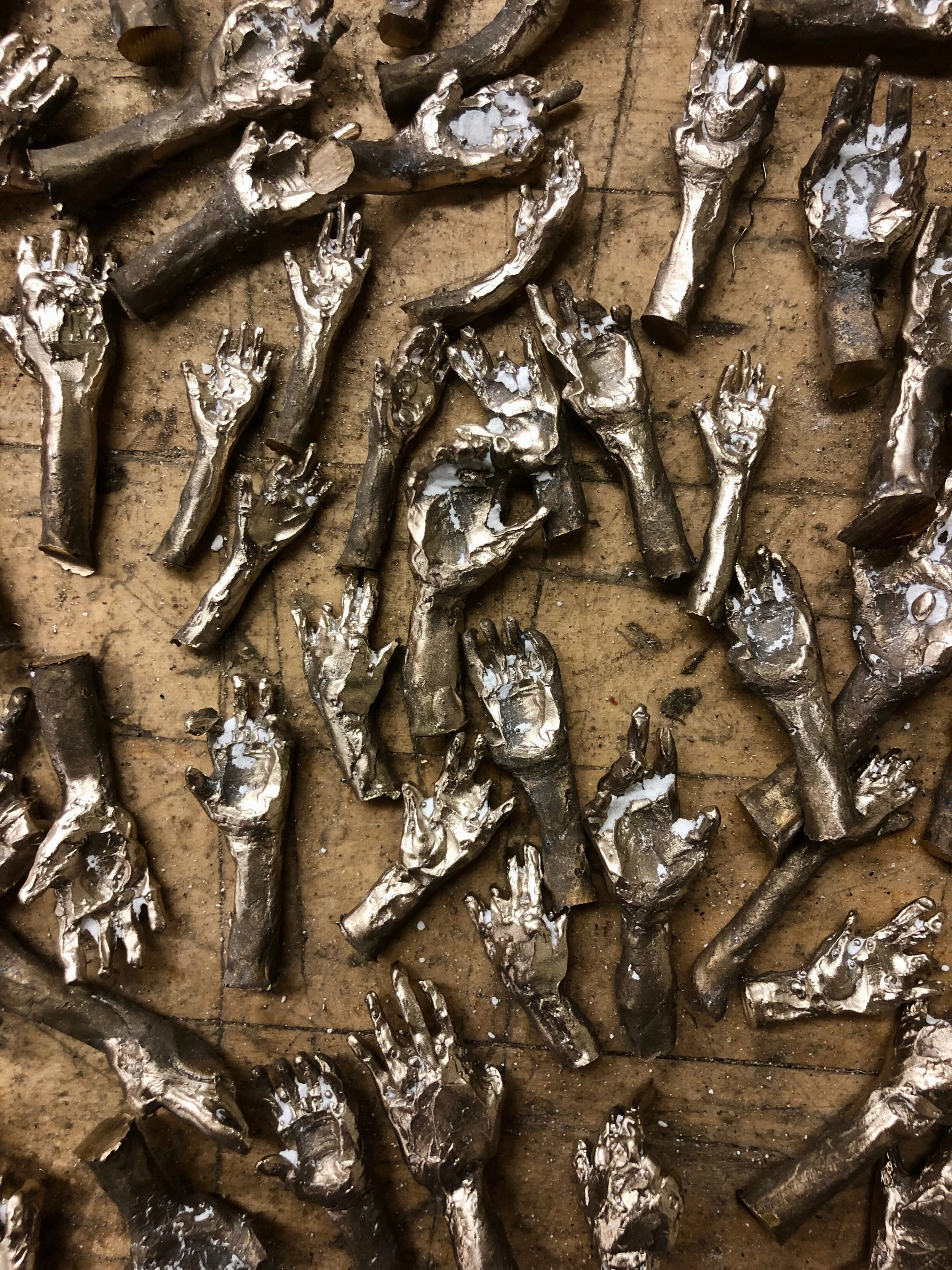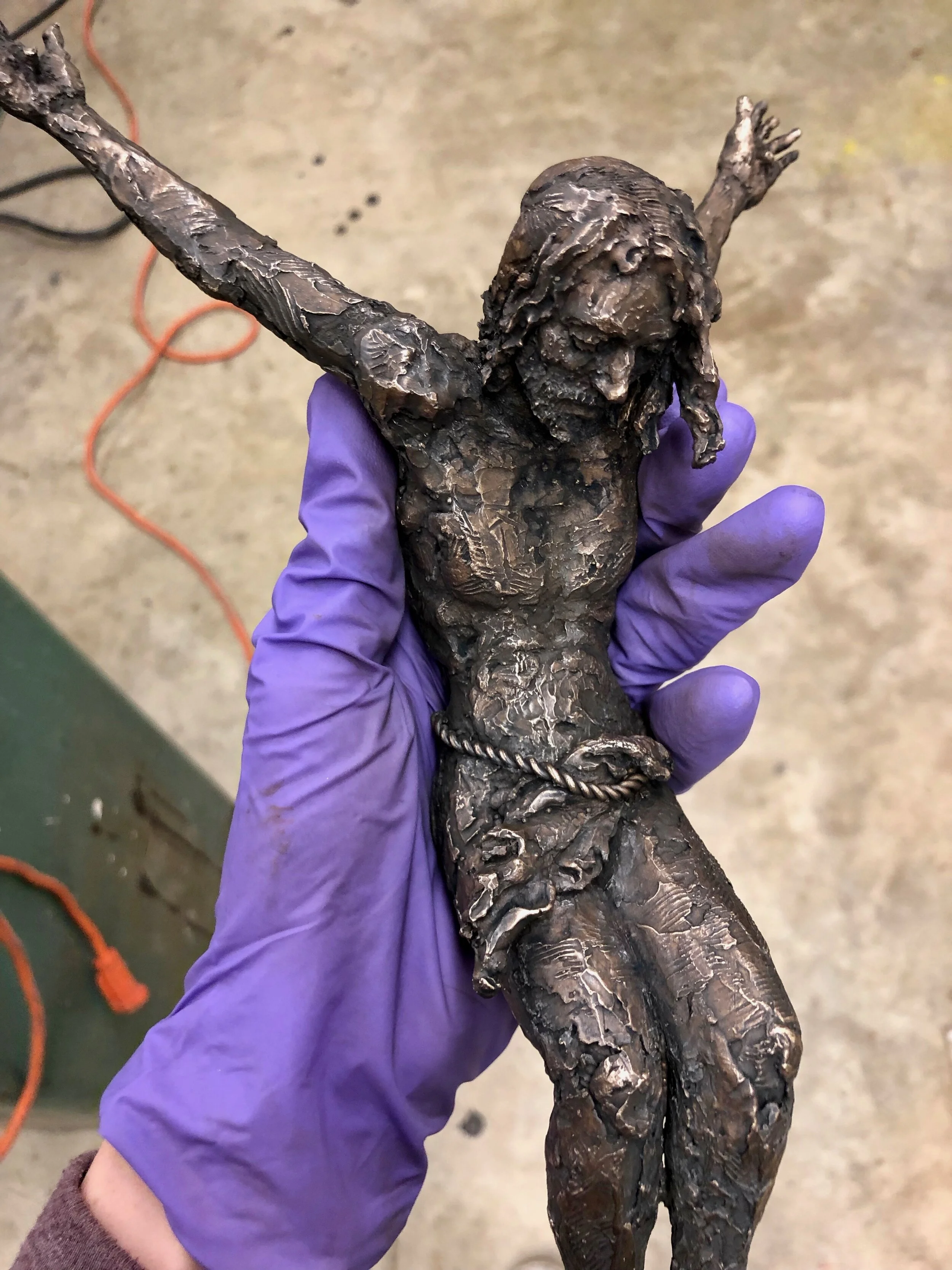 Sprue systems are dipped in silica slurry and covered in silica grit over a period of days, building up the silica to form a shell around the wax. This system is then fired, melting out the wax and producing a hard ceramic shell mould. The shells are then filled with molten bronze and left to cool. Once cool, the ceramic shells are removed from the cast bronze with chisels, hammers and sandblasters. The sculptures are then cut from the remaining bronze sprue system and are chased with metal working tools to hide signs of the sprue system and to fix blemishes. When sculptures have been chased and assembled to the satisfaction of the artist, they are finished with a patina which is made from layering chemicals on the surface of the bronze at different temperatures.