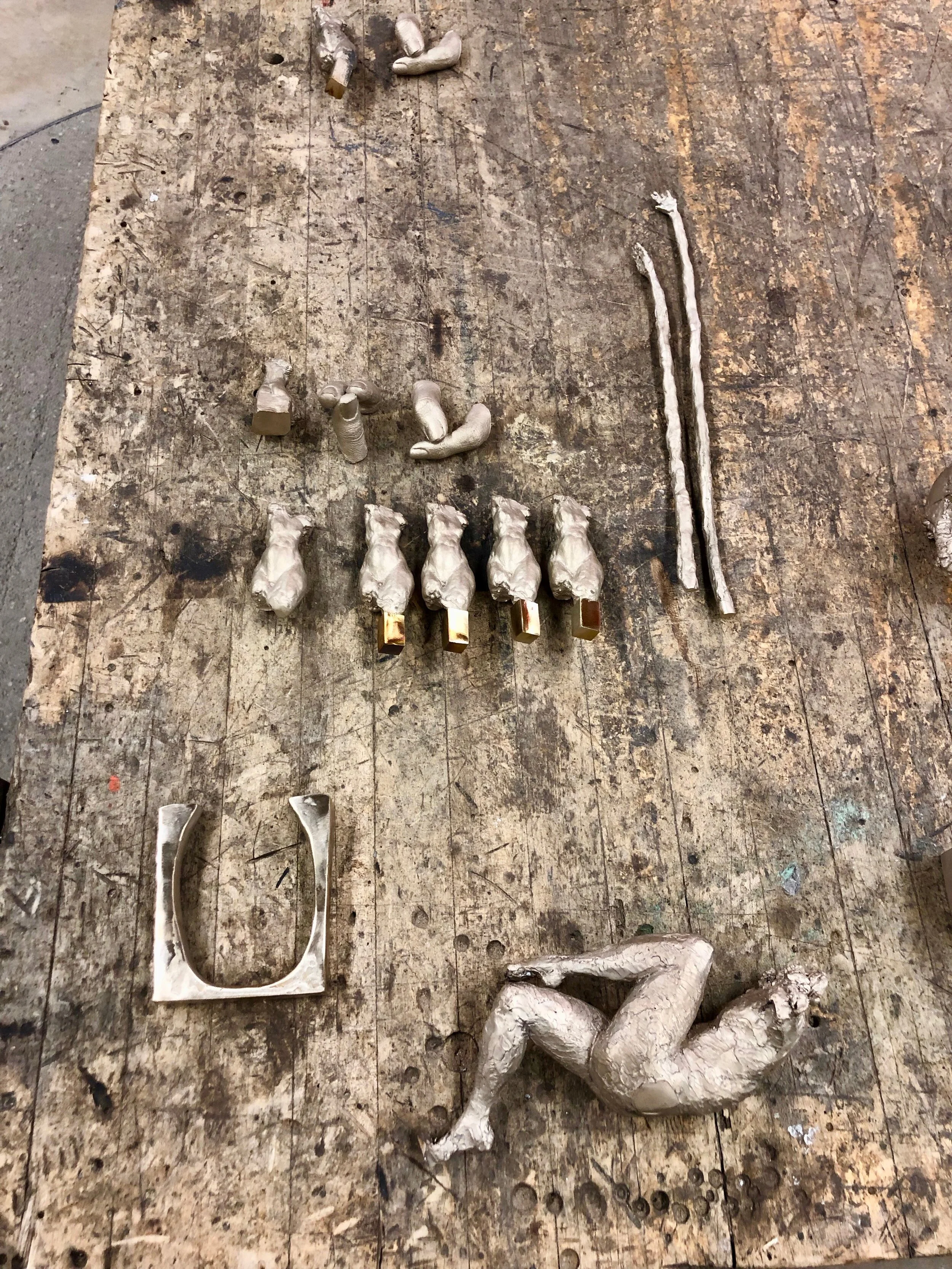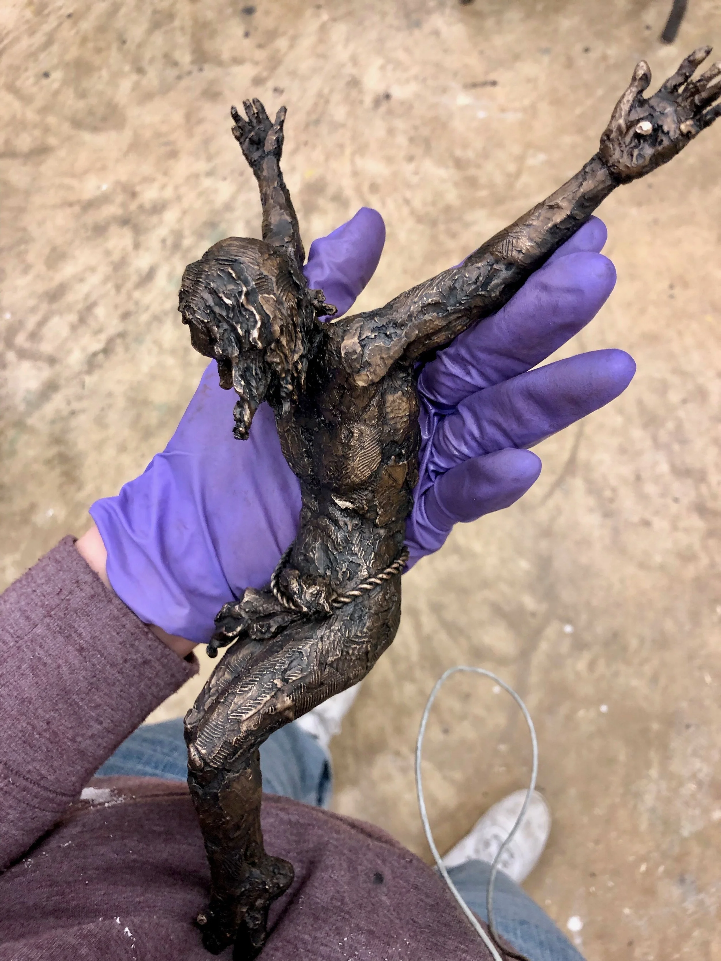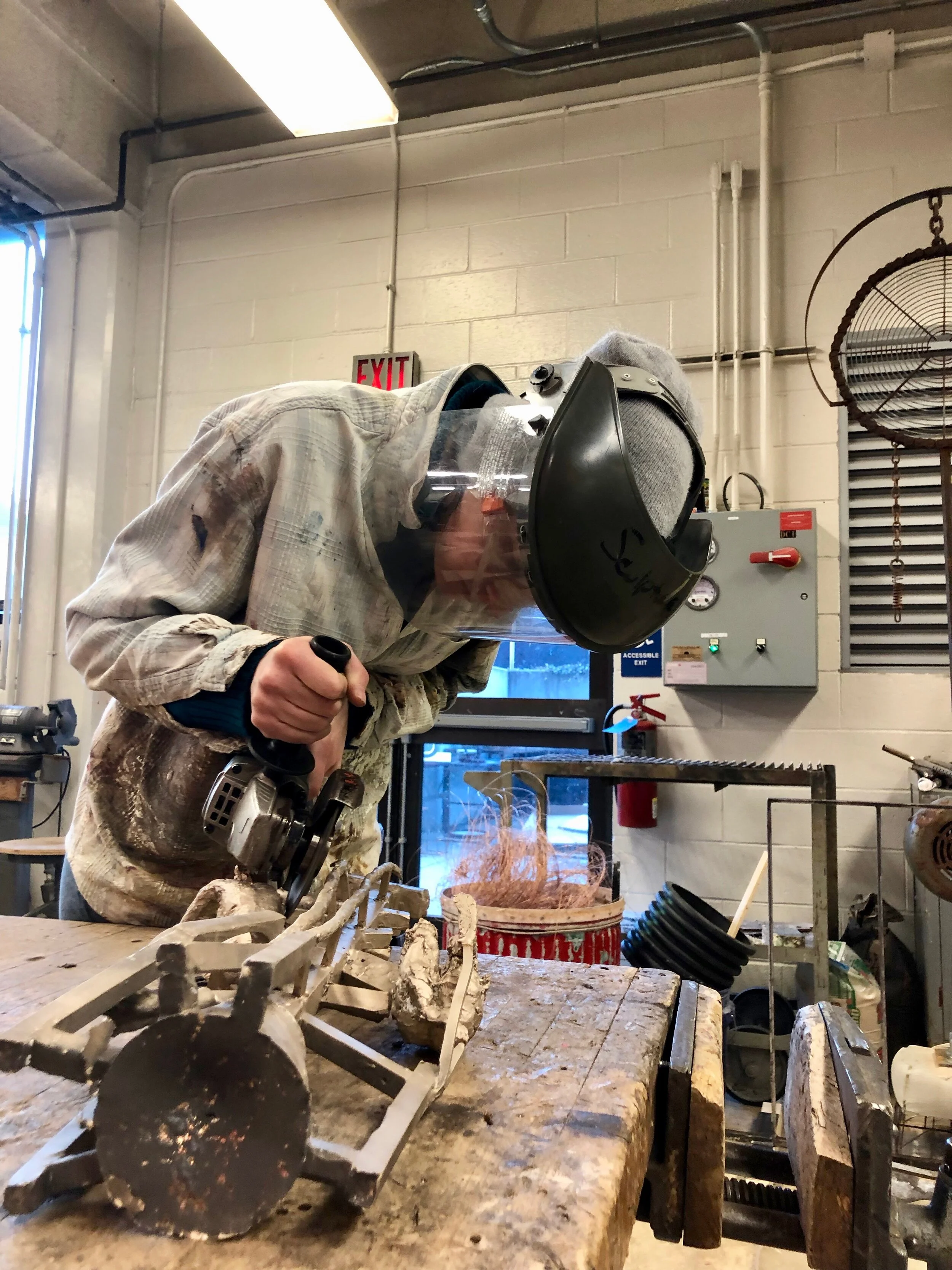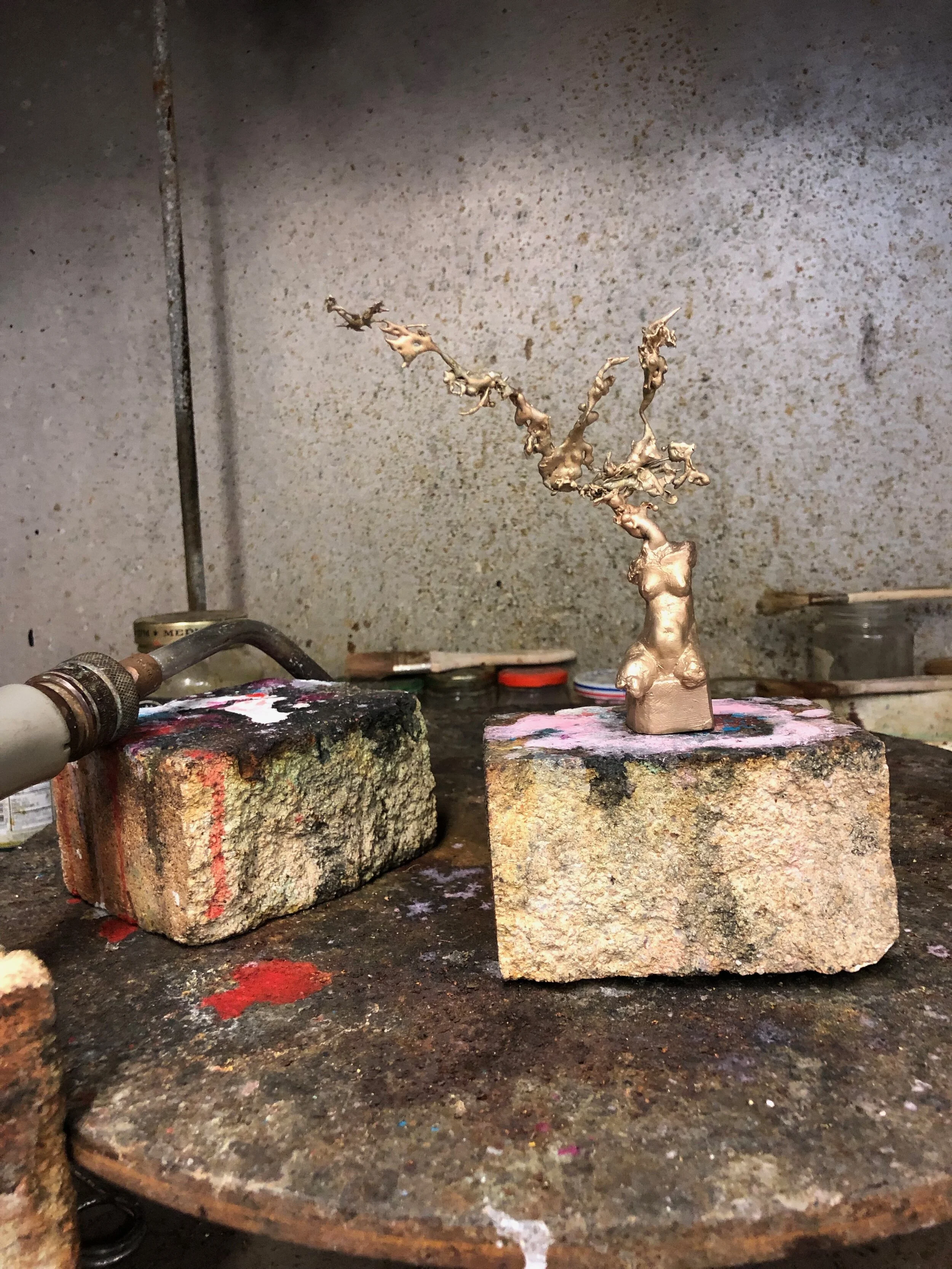 Sprue systems are dipped in silica slurry and covered in silica grit over a period of days, building up the silica to form a shell around the wax. This system is then fired, melting out the wax and producing a hard ceramic shell mould. The shells are then filled with molten bronze and left to cool. Once cool, the ceramic shells are removed from the cast bronze with chisels, hammers and sandblasters. The sculptures are then cut from the remaining bronze sprue system and are chased with metal working tools to hide signs of the sprue system and to fix blemishes. When sculptures have been chased and assembled to the satisfaction of the artist, they are finished with a patina which is made from layering chemicals on the surface of the bronze at different temperatures.