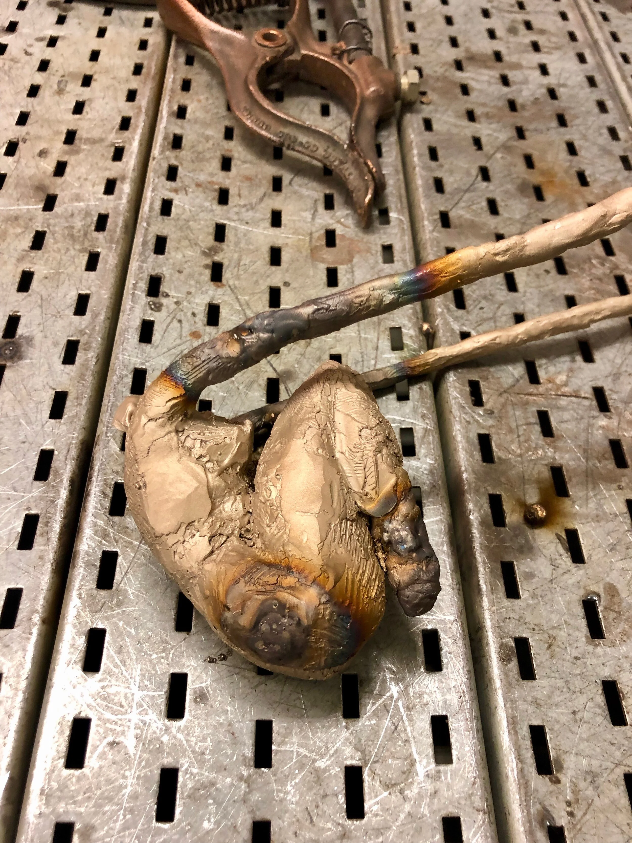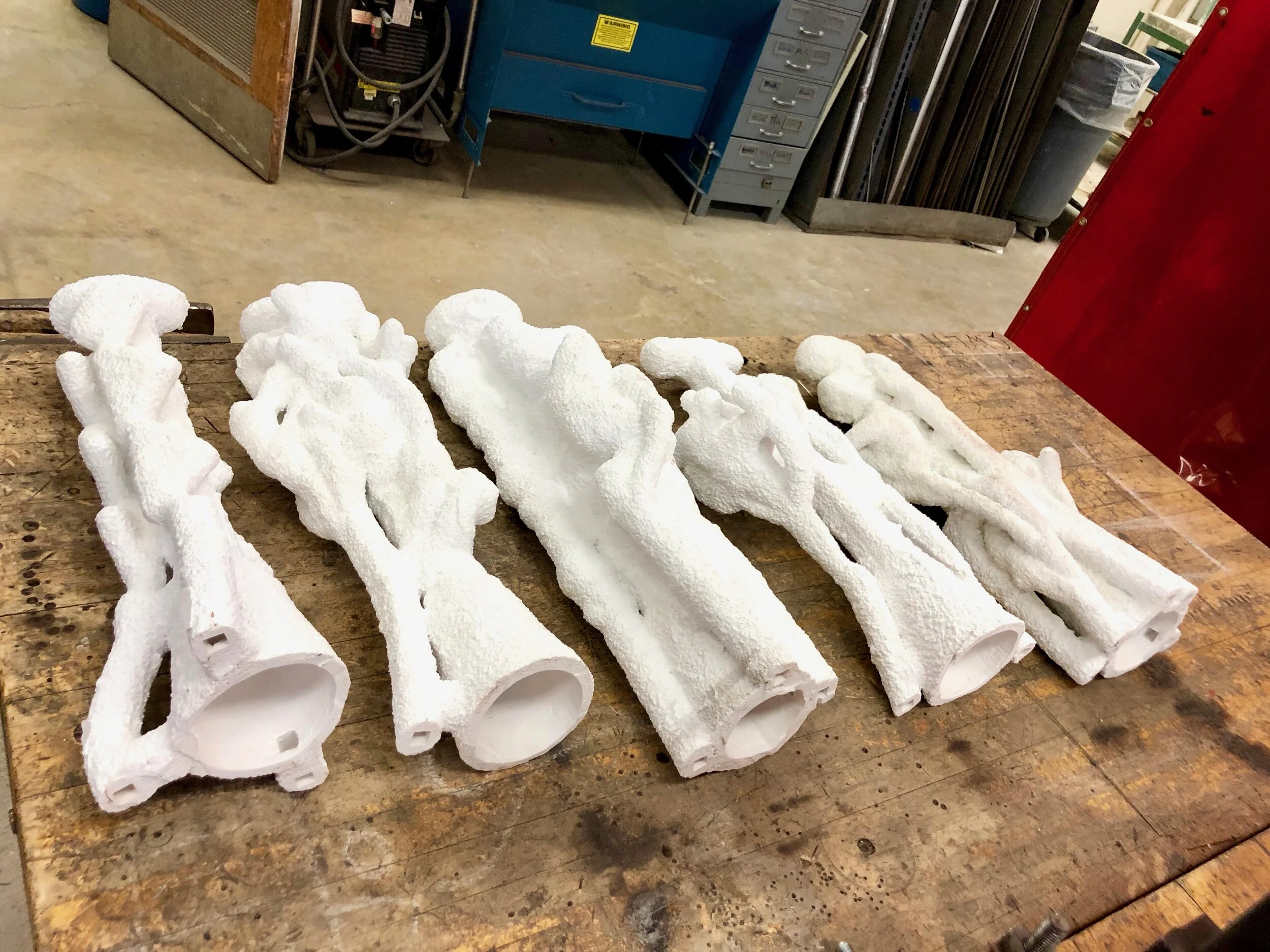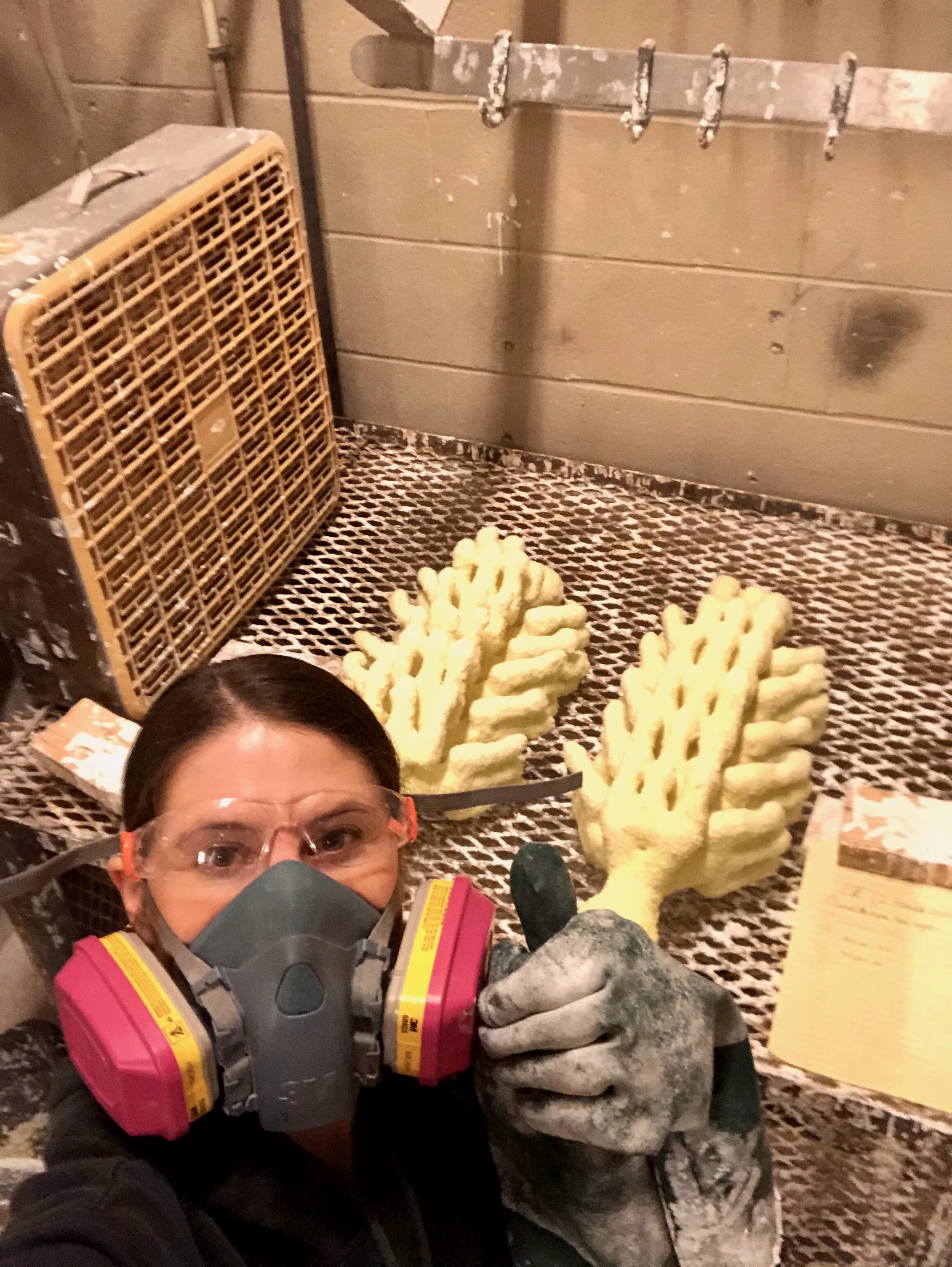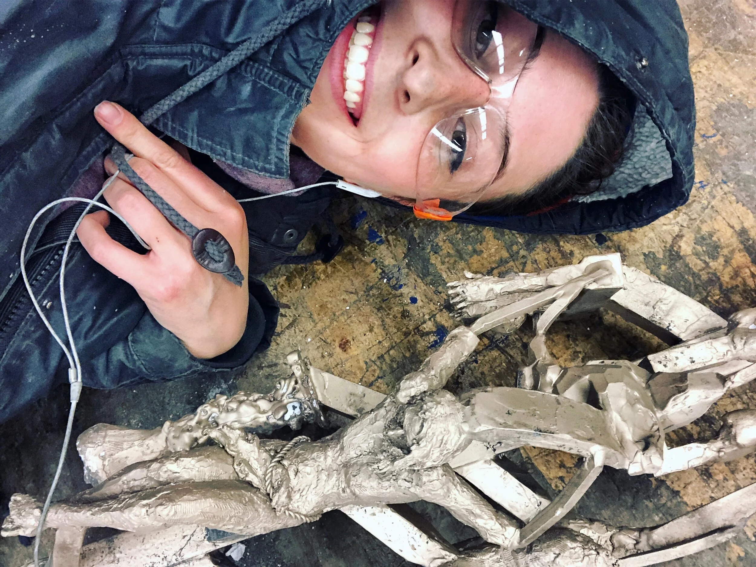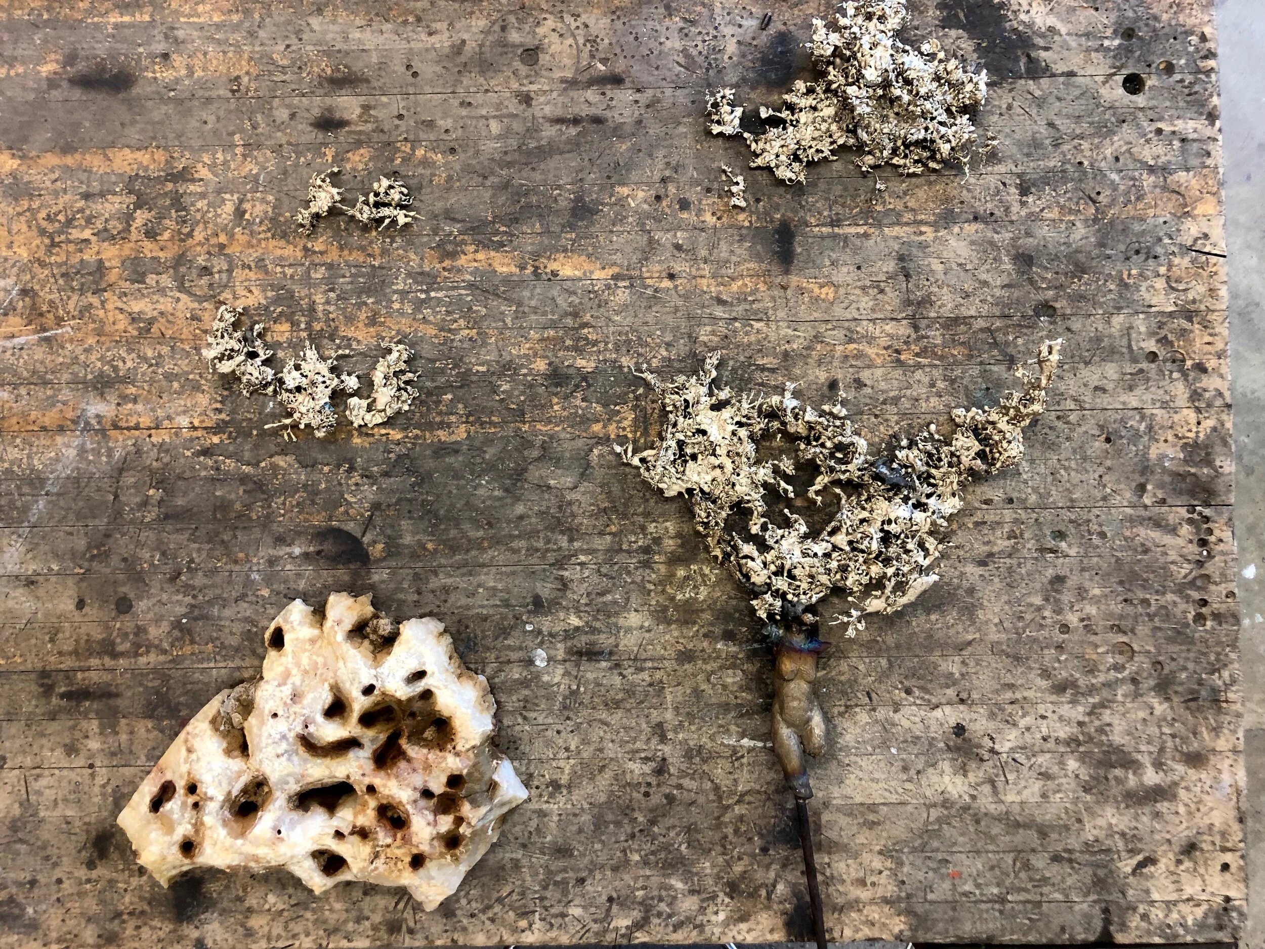 Sprue systems are dipped in silica slurry and covered in silica grit over a period of days, building up the silica to form a shell around the wax. This system is then fired, melting out the wax and producing a hard ceramic shell mould. The shells are then filled with molten bronze and left to cool. Once cool, the ceramic shells are removed from the cast bronze with chisels, hammers and sandblasters. The sculptures are then cut from the remaining bronze sprue system and are chased with metal working tools to hide signs of the sprue system and to fix blemishes. When sculptures have been chased and assembled to the satisfaction of the artist, they are finished with a patina which is made from layering chemicals on the surface of the bronze at different temperatures.