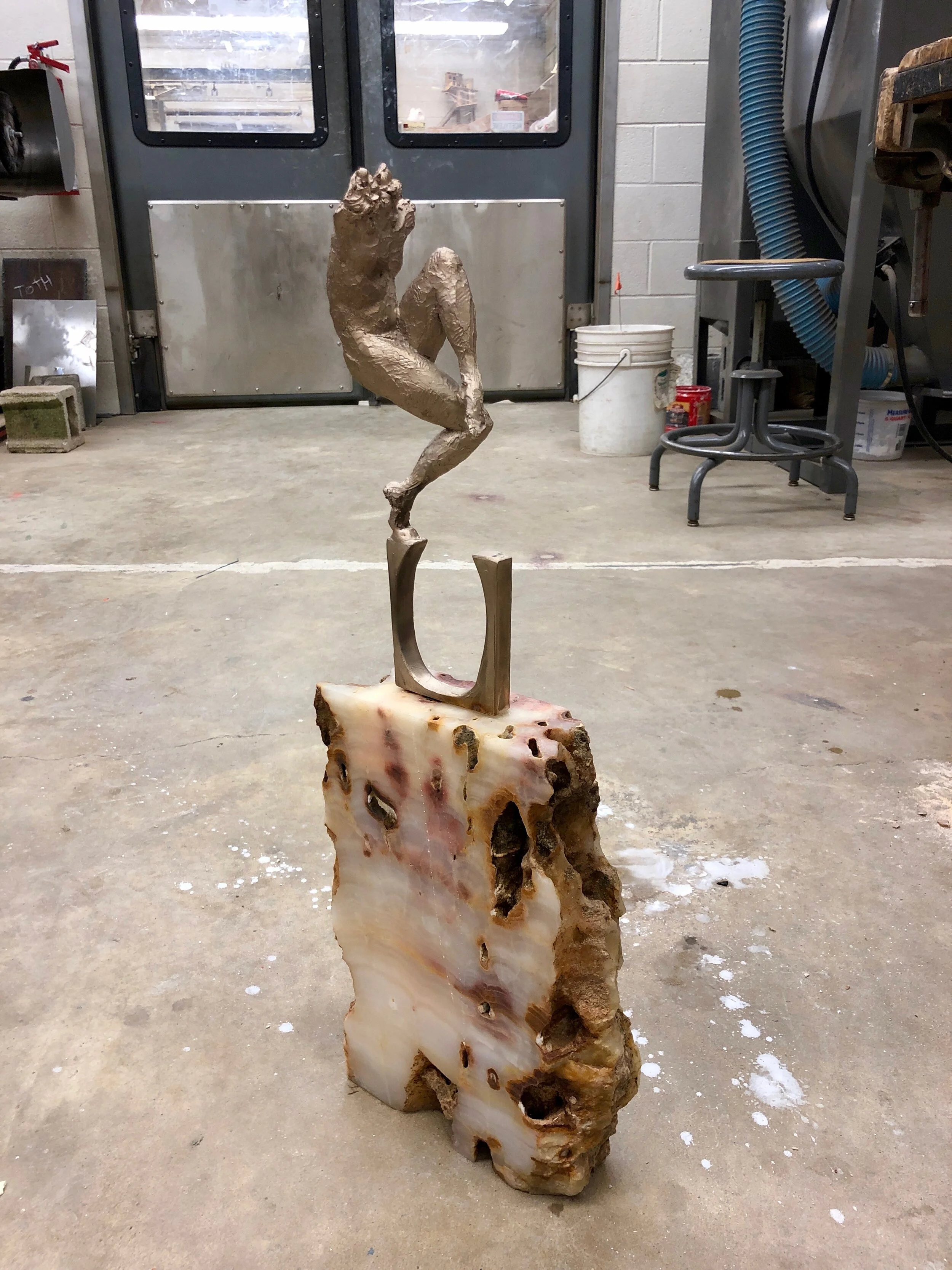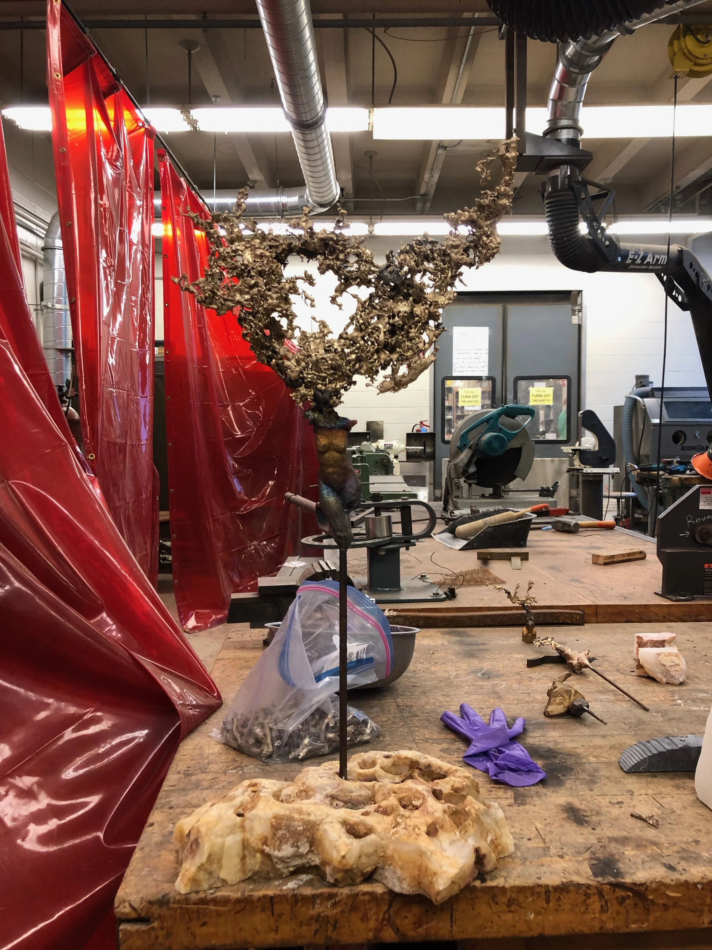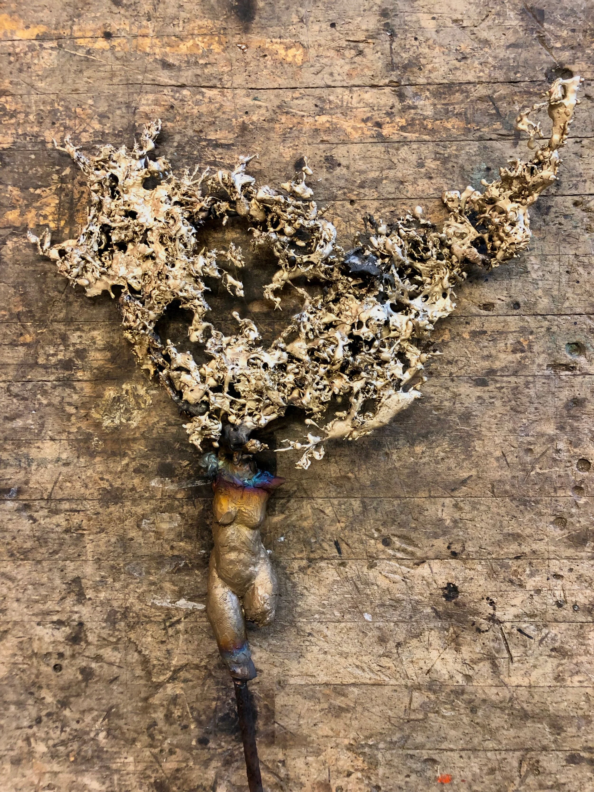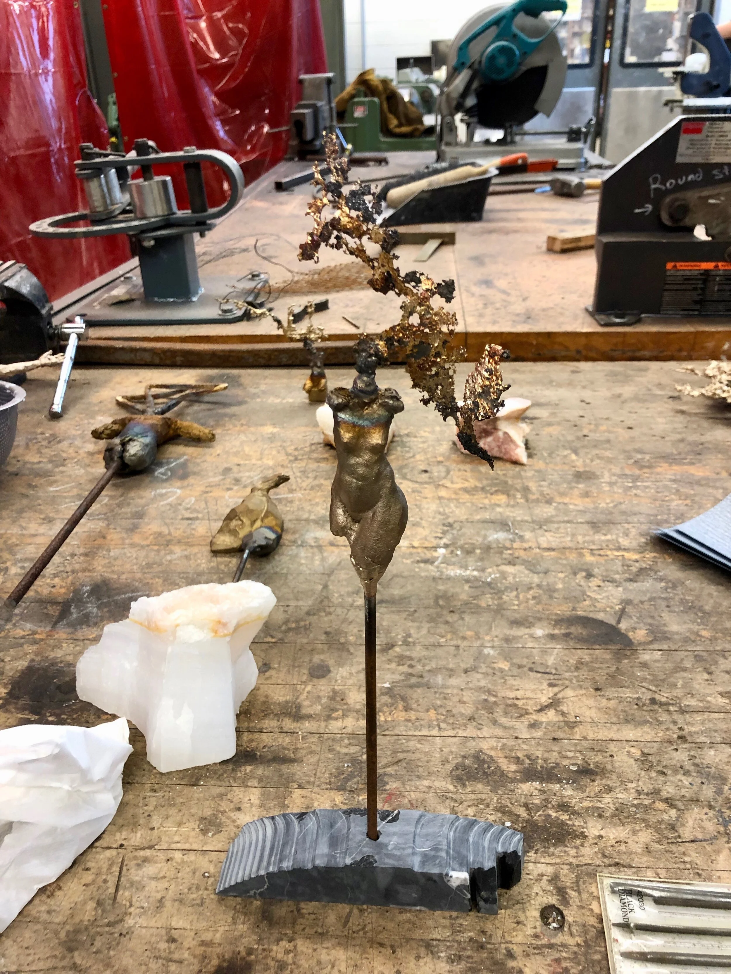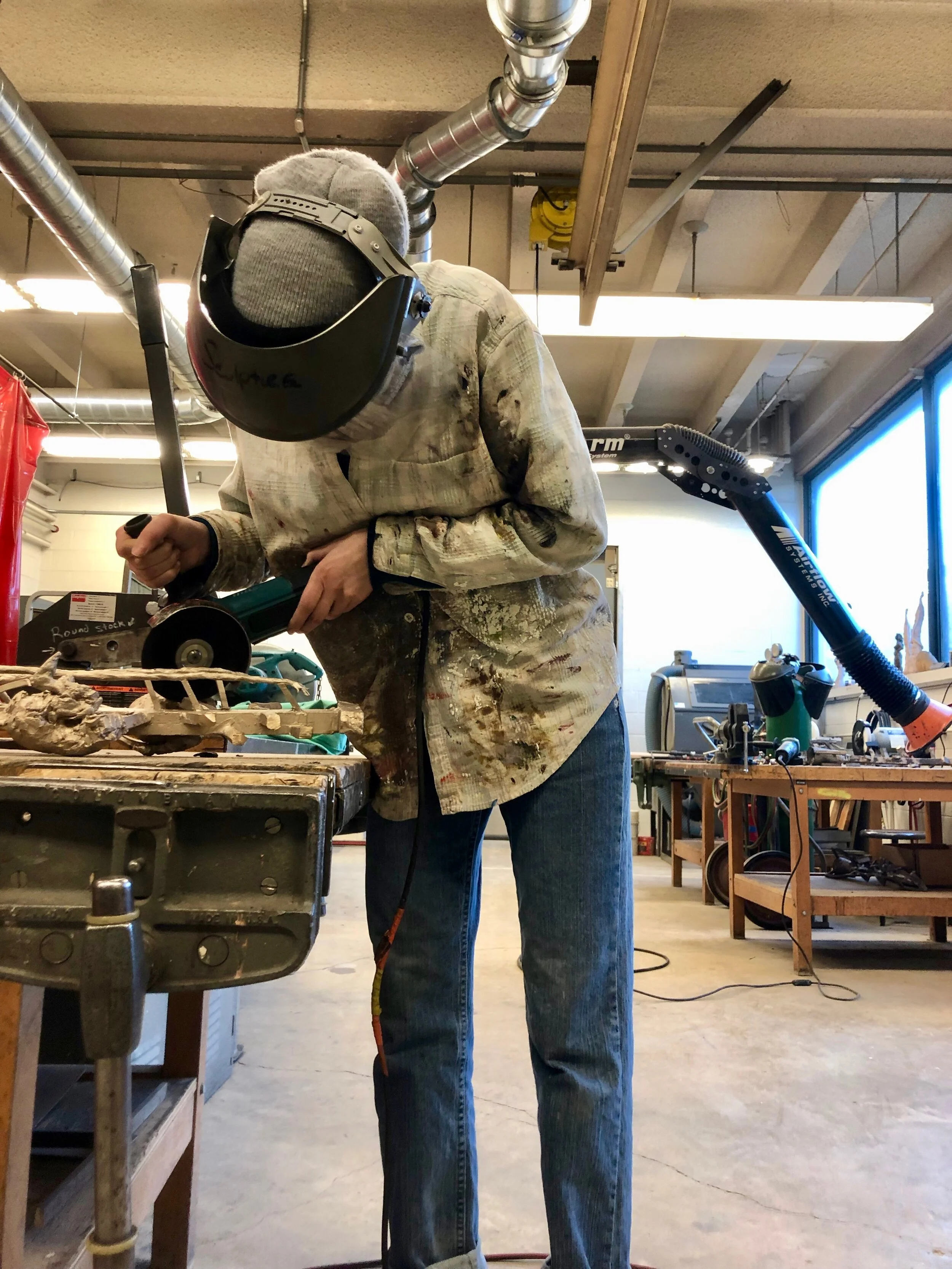 Sprue systems are dipped in silica slurry and covered in silica grit over a period of days, building up the silica to form a shell around the wax. This system is then fired, melting out the wax and producing a hard ceramic shell mould. The shells are then filled with molten bronze and left to cool. Once cool, the ceramic shells are removed from the cast bronze with chisels, hammers and sandblasters. The sculptures are then cut from the remaining bronze sprue system and are chased with metal working tools to hide signs of the sprue system and to fix blemishes. When sculptures have been chased and assembled to the satisfaction of the artist, they are finished with a patina which is made from layering chemicals on the surface of the bronze at different temperatures.