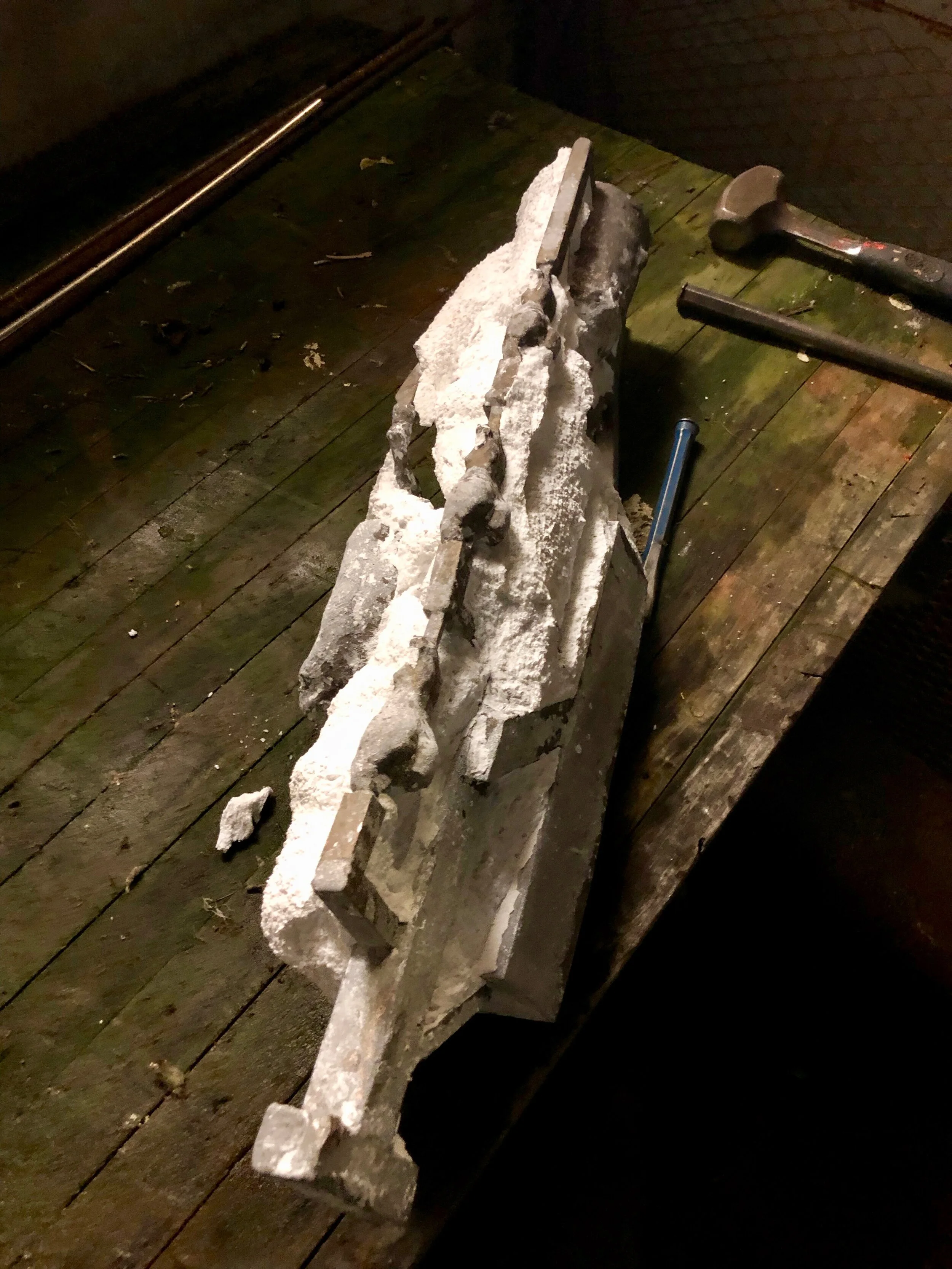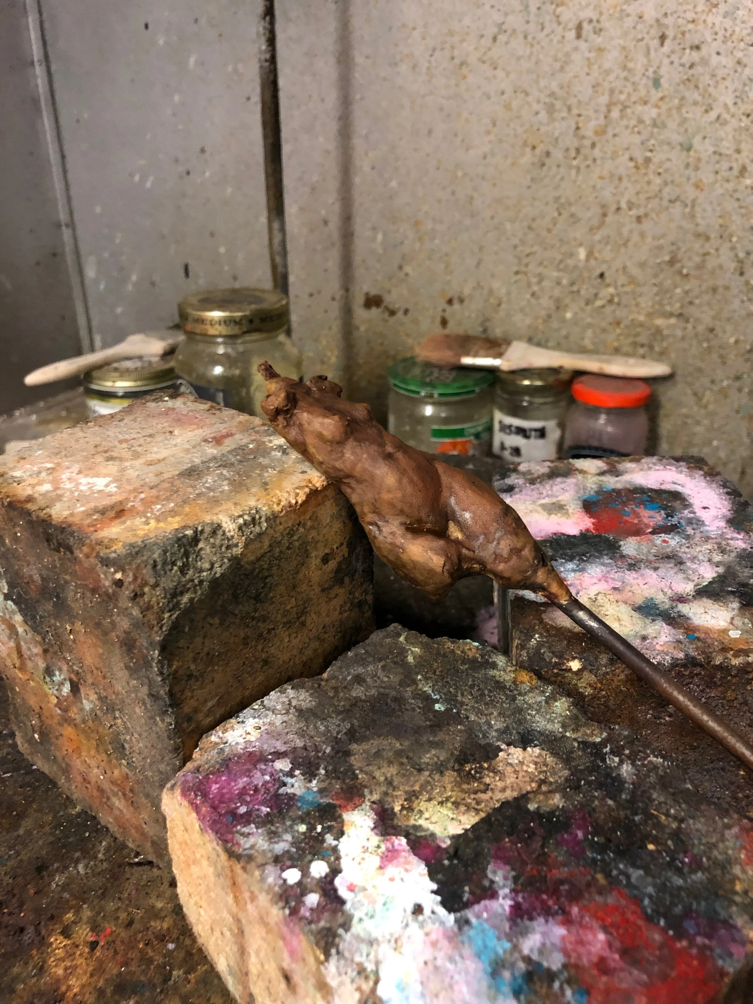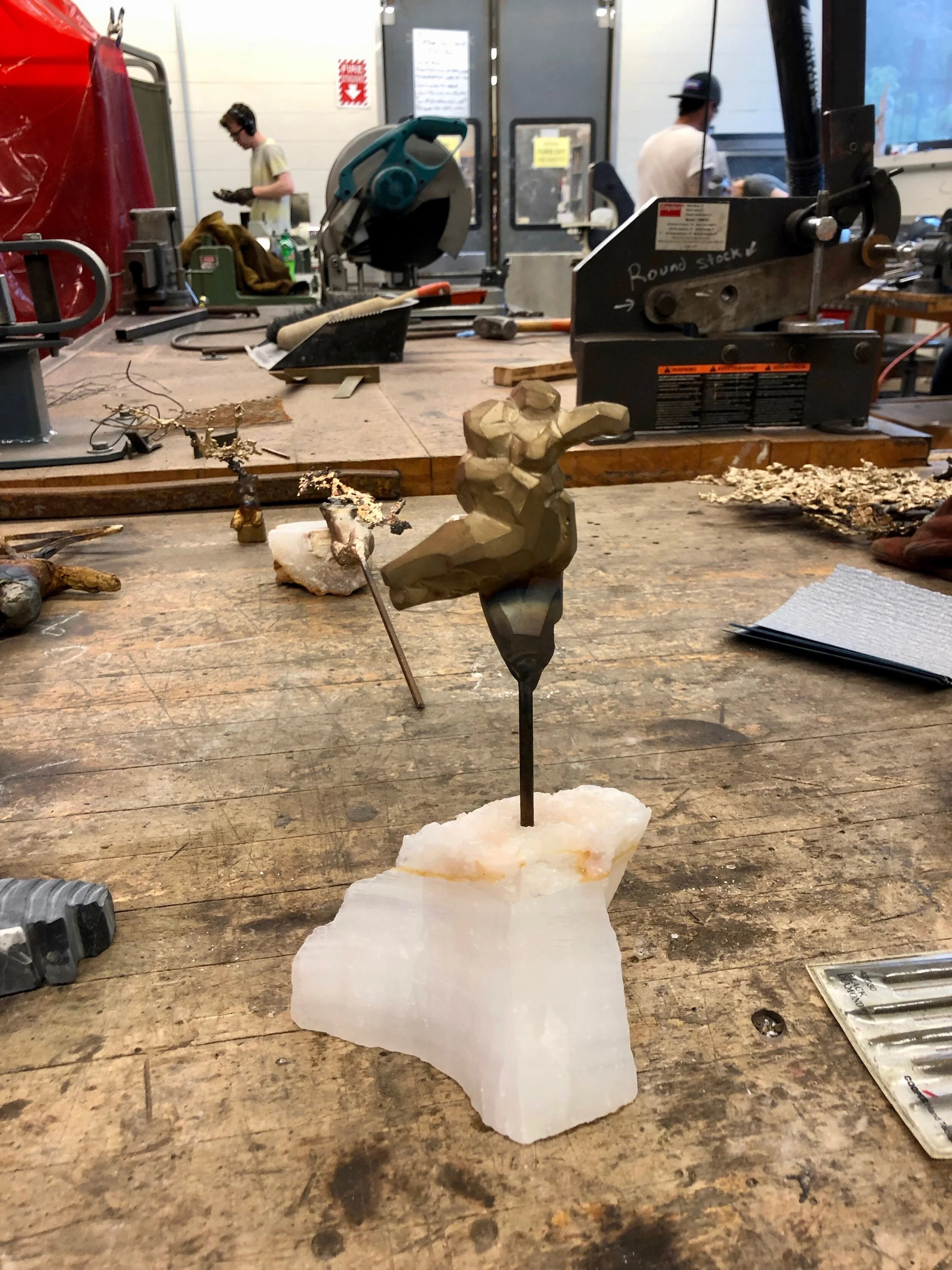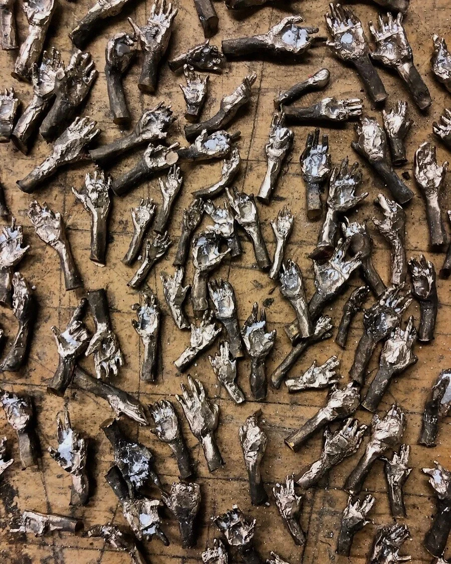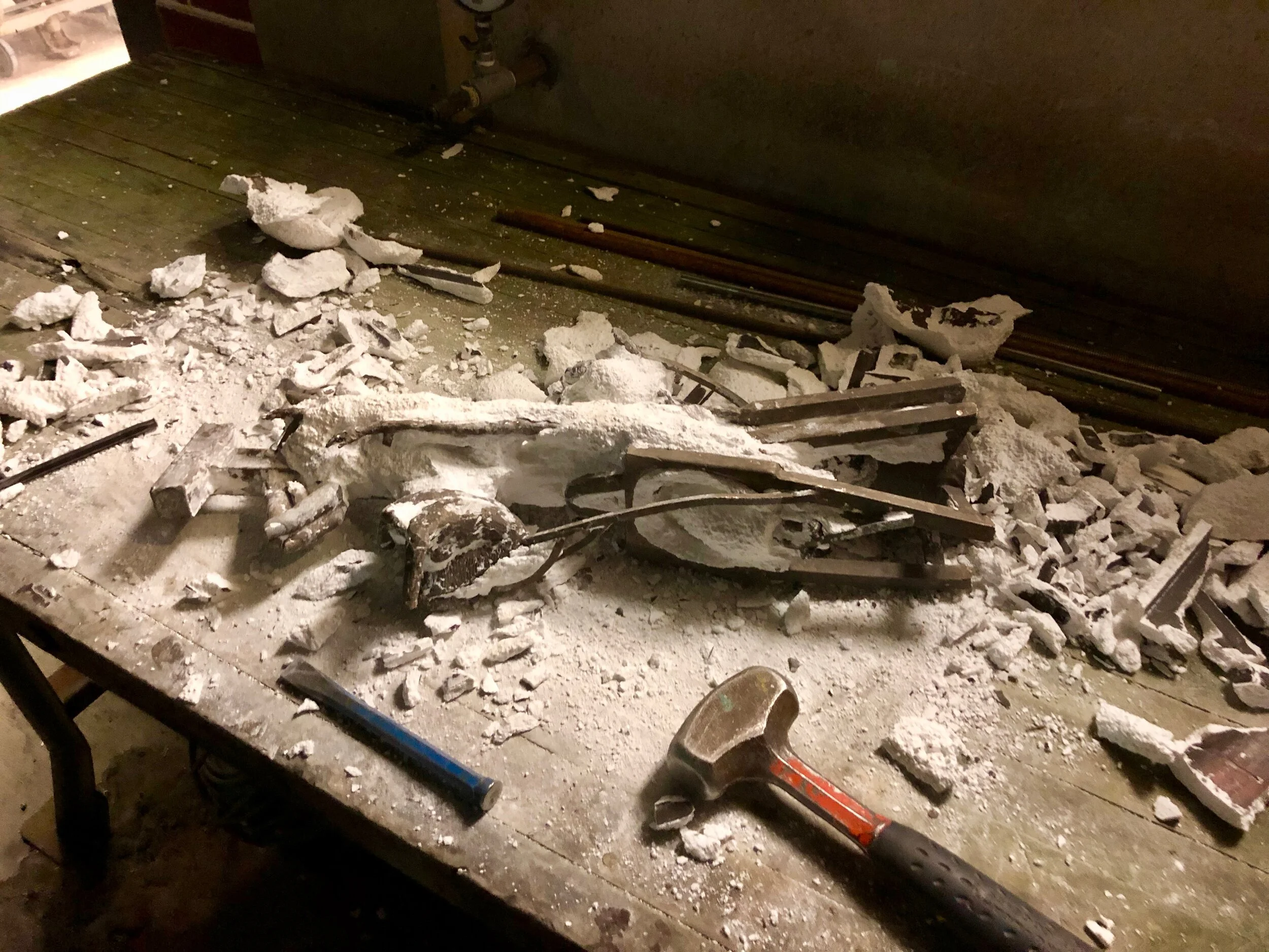 Sprue systems are dipped in silica slurry and covered in silica grit over a period of days, building up the silica to form a shell around the wax. This system is then fired, melting out the wax and producing a hard ceramic shell mould. The shells are then filled with molten bronze and left to cool. Once cool, the ceramic shells are removed from the cast bronze with chisels, hammers and sandblasters. The sculptures are then cut from the remaining bronze sprue system and are chased with metal working tools to hide signs of the sprue system and to fix blemishes. When sculptures have been chased and assembled to the satisfaction of the artist, they are finished with a patina which is made from layering chemicals on the surface of the bronze at different temperatures.