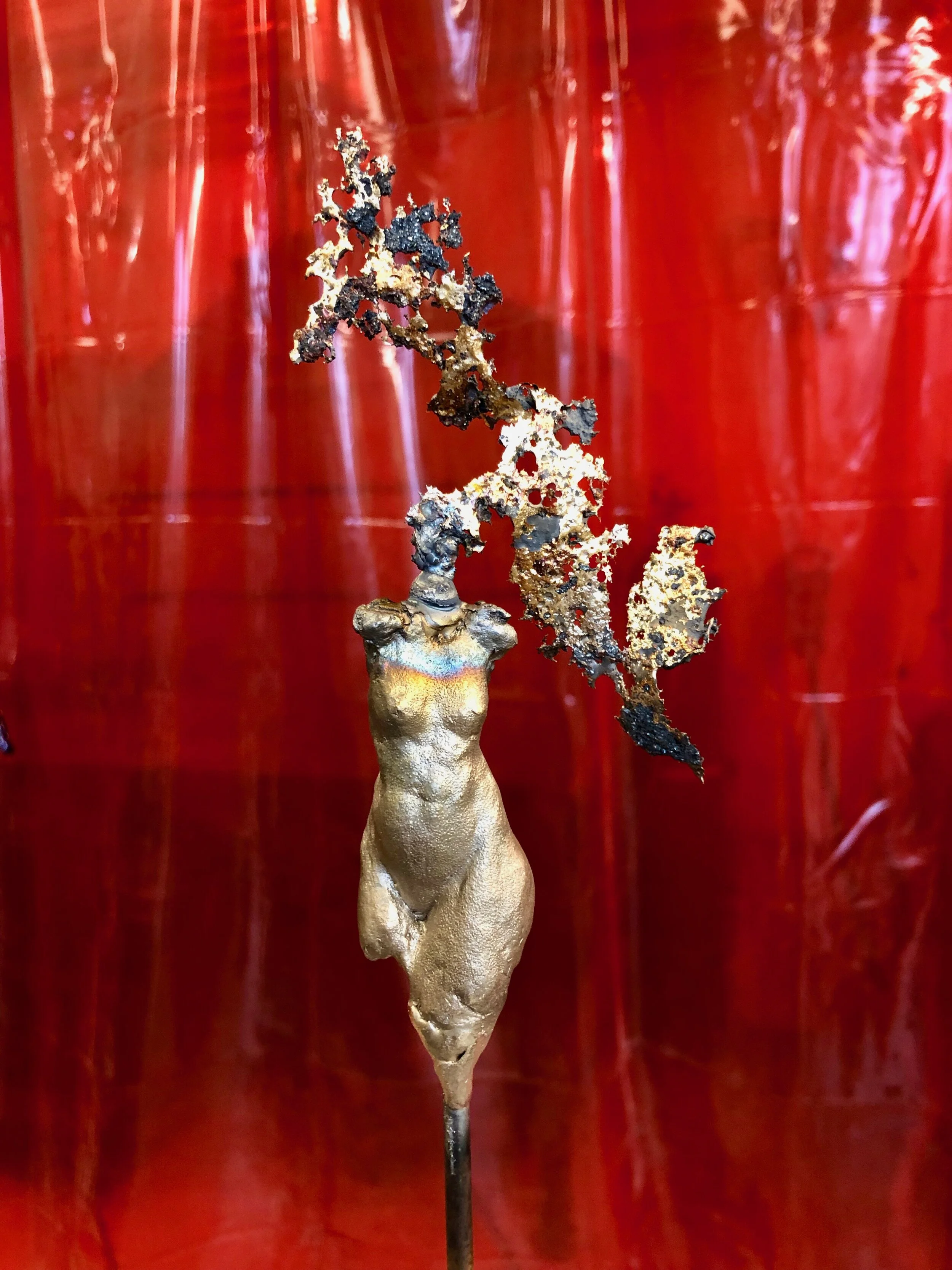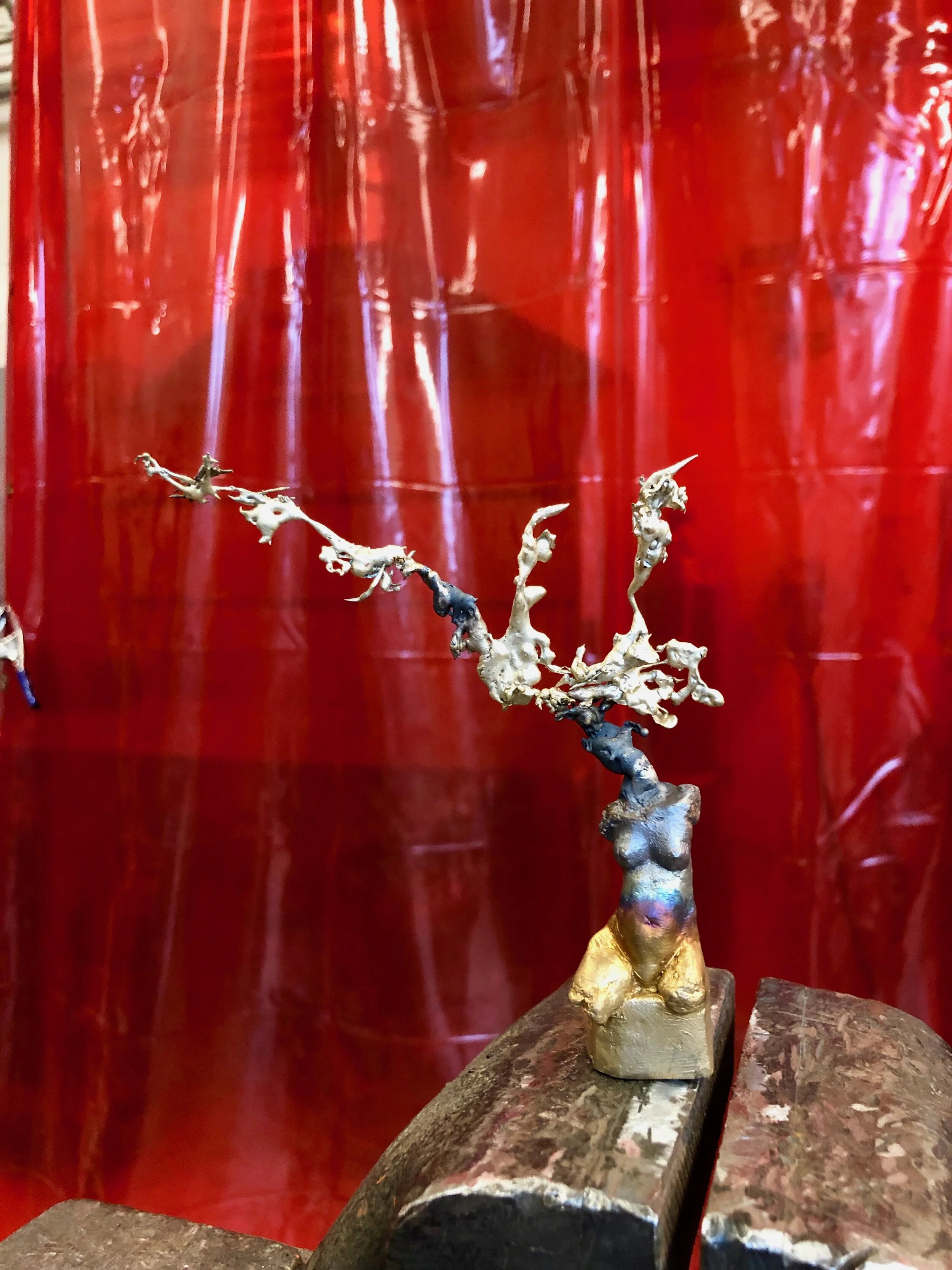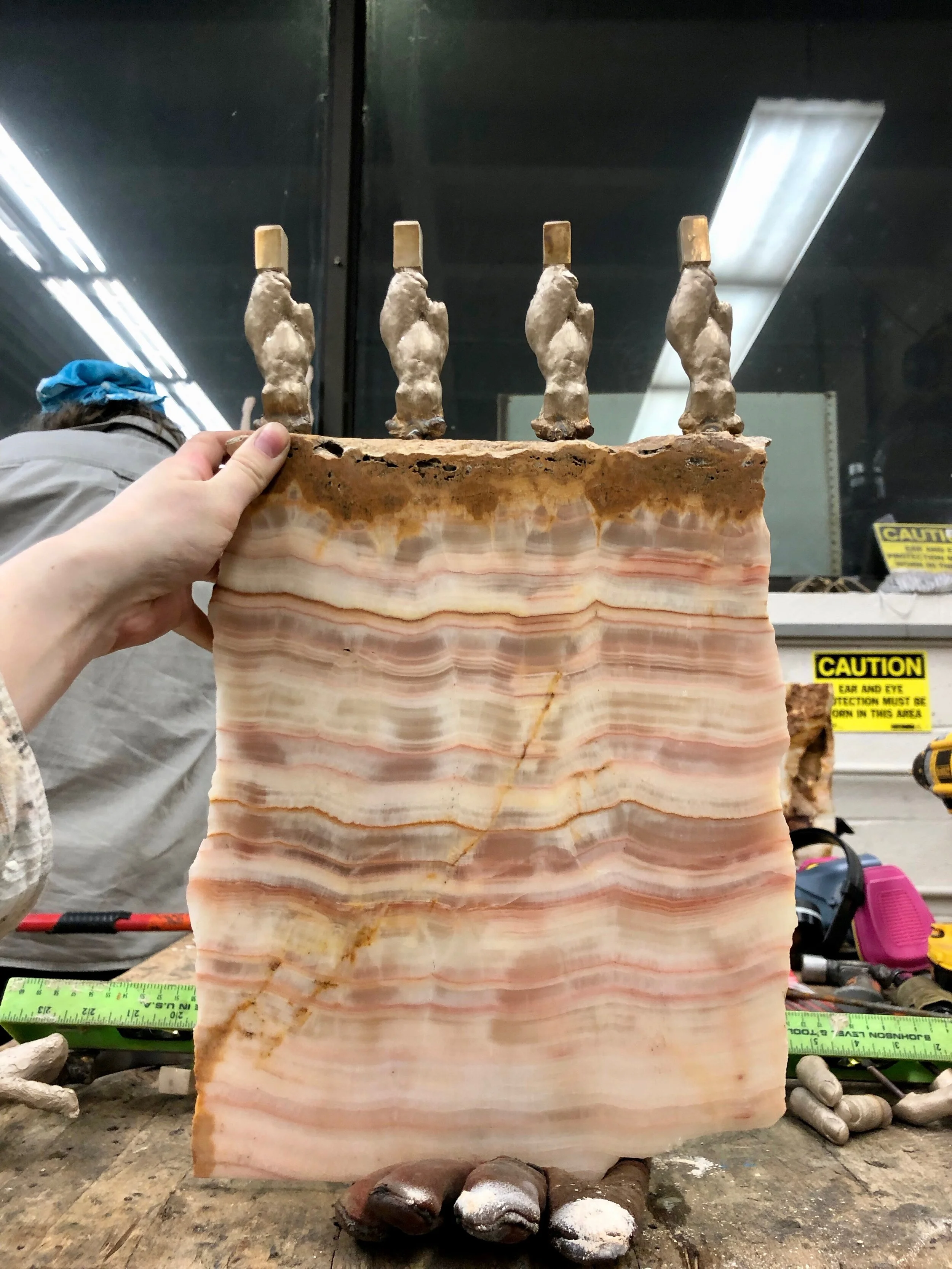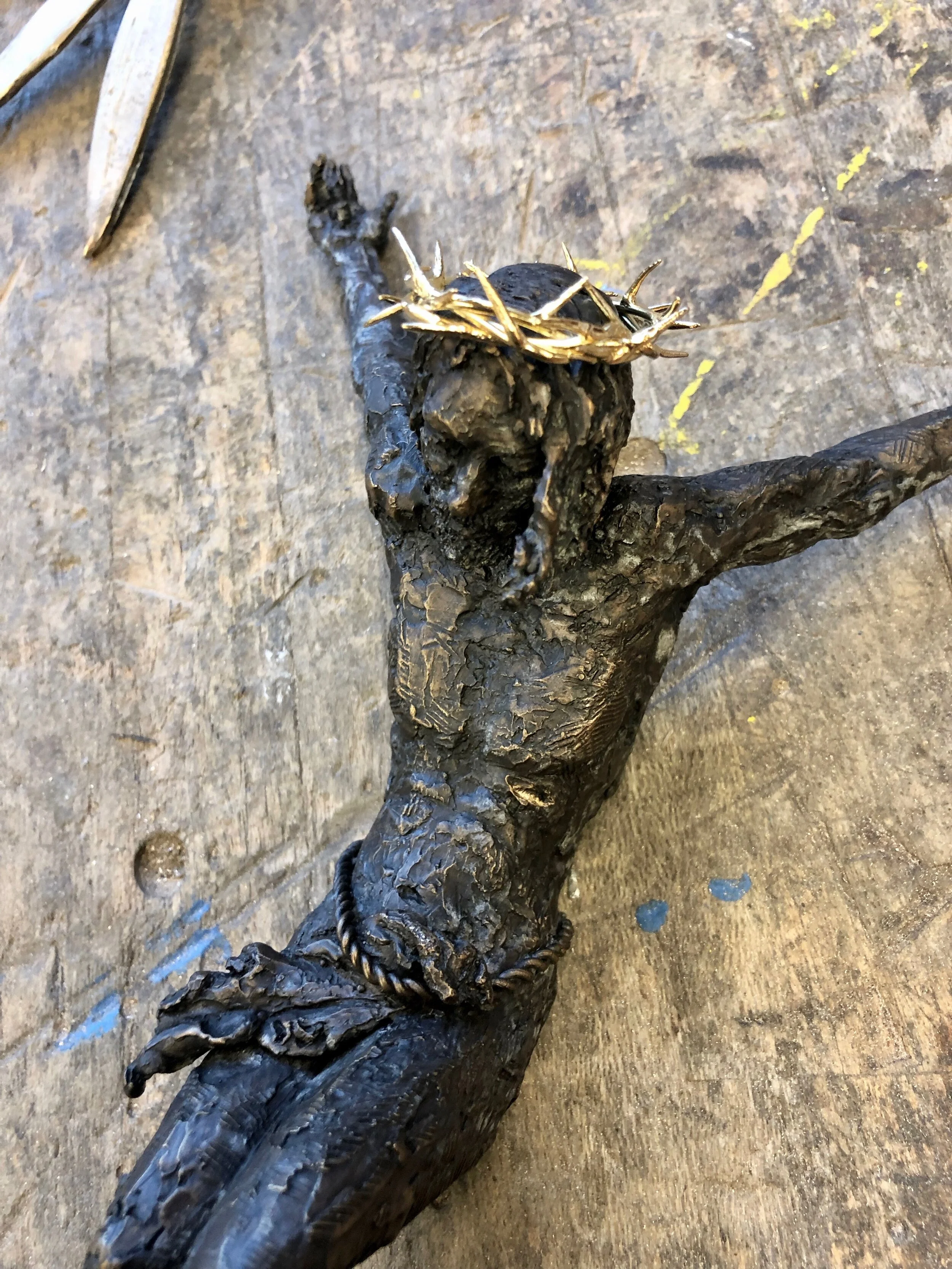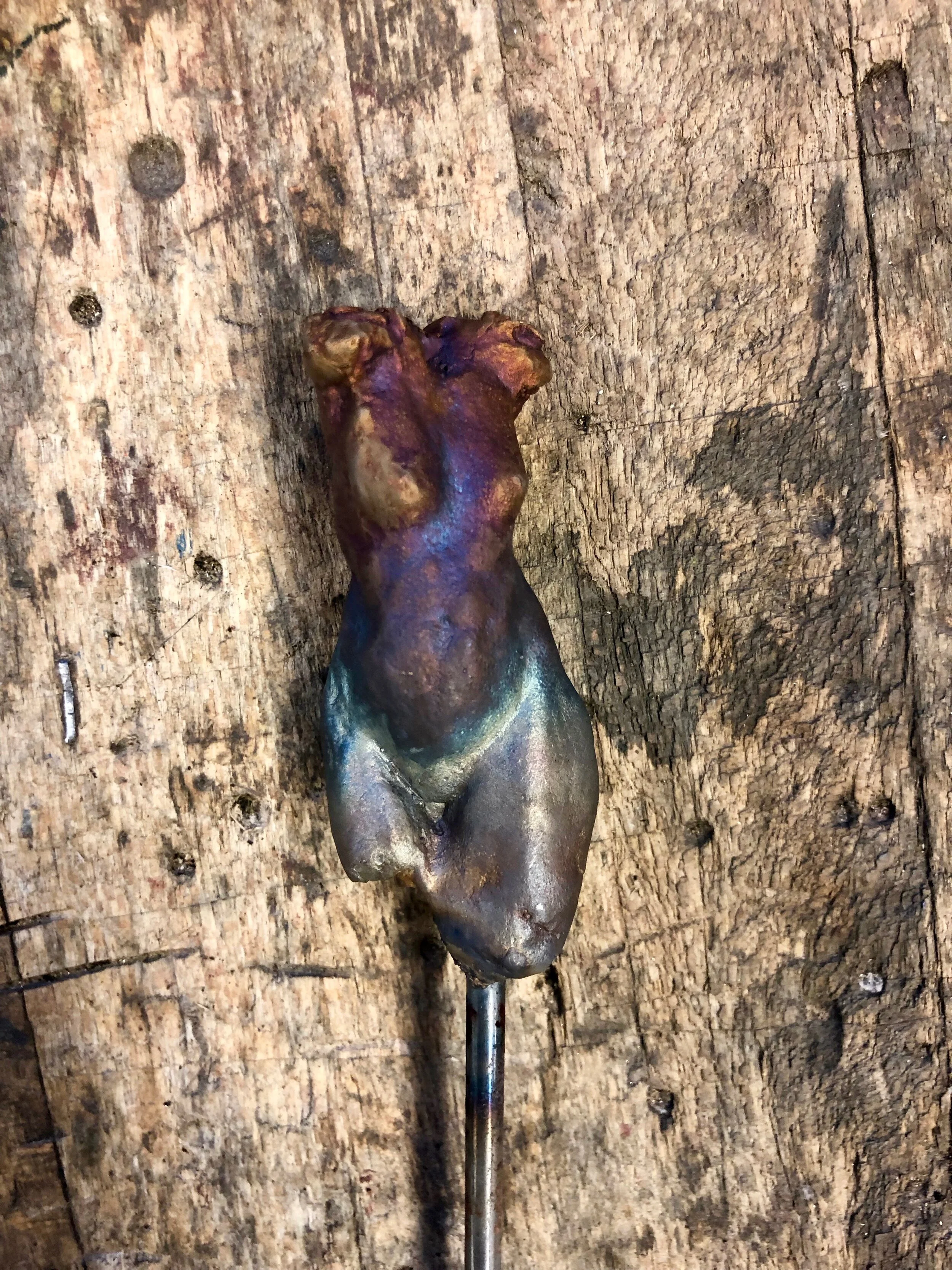 Sprue systems are dipped in silica slurry and covered in silica grit over a period of days, building up the silica to form a shell around the wax. This system is then fired, melting out the wax and producing a hard ceramic shell mould. The shells are then filled with molten bronze and left to cool. Once cool, the ceramic shells are removed from the cast bronze with chisels, hammers and sandblasters. The sculptures are then cut from the remaining bronze sprue system and are chased with metal working tools to hide signs of the sprue system and to fix blemishes. When sculptures have been chased and assembled to the satisfaction of the artist, they are finished with a patina which is made from layering chemicals on the surface of the bronze at different temperatures.