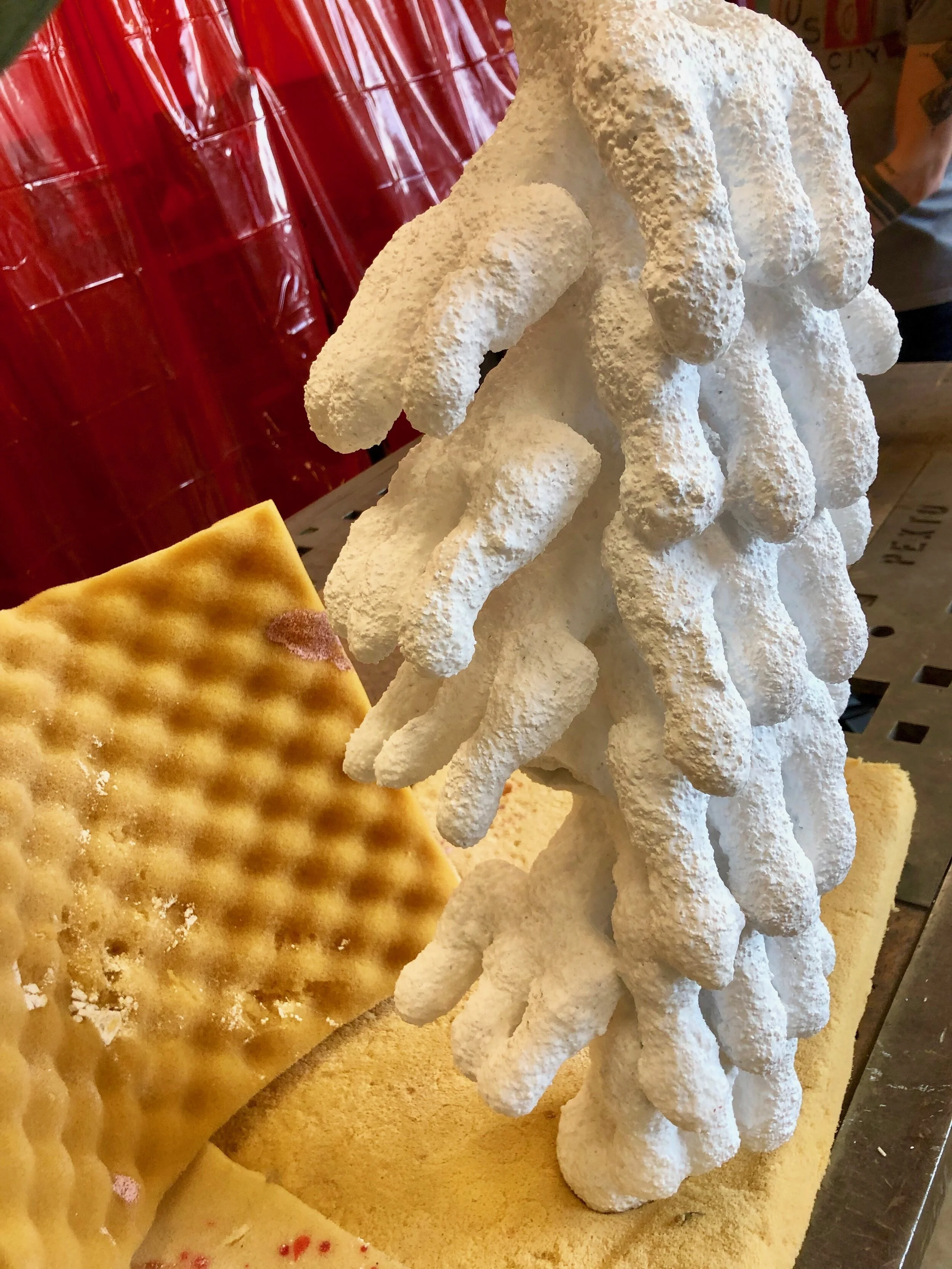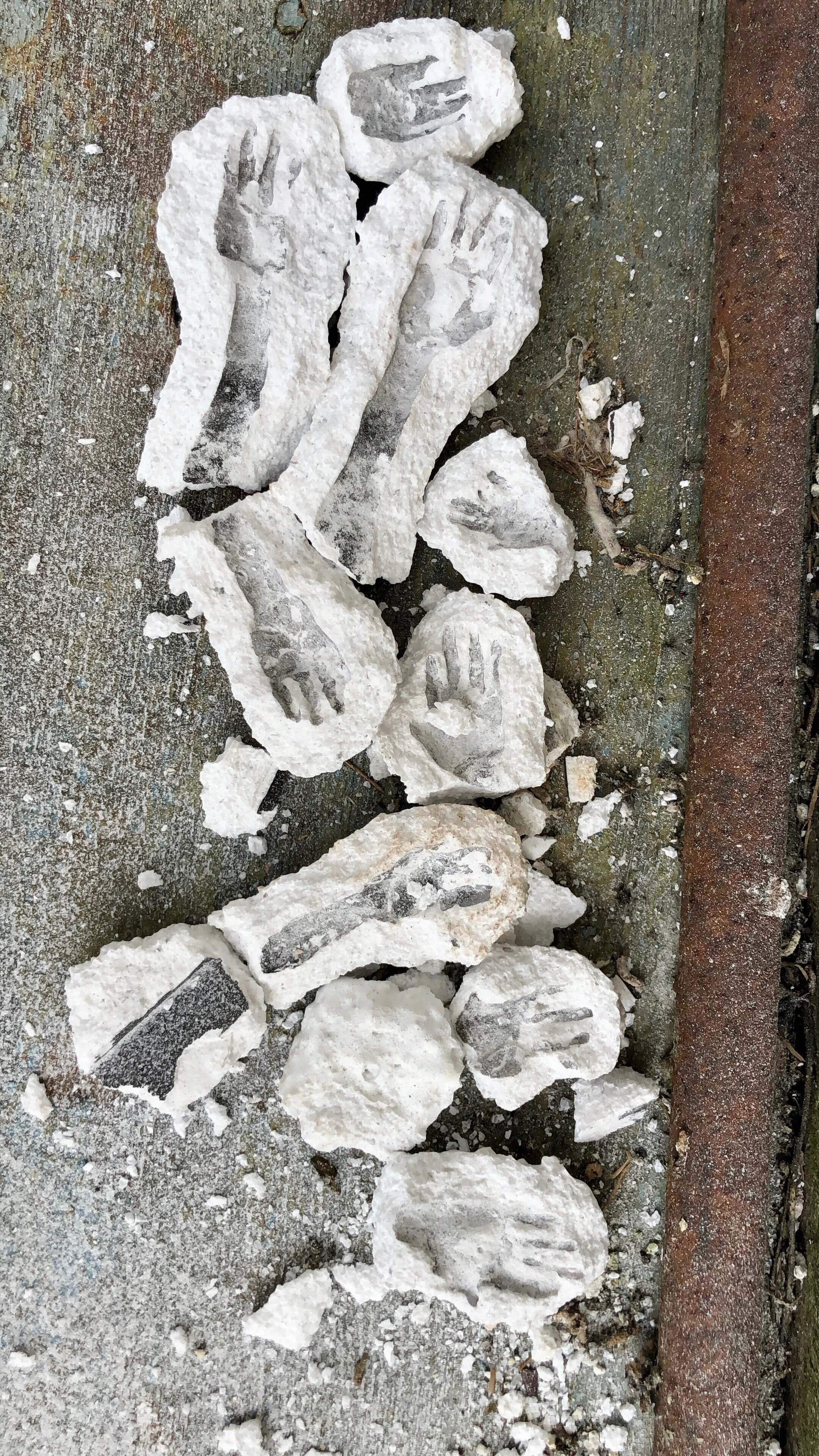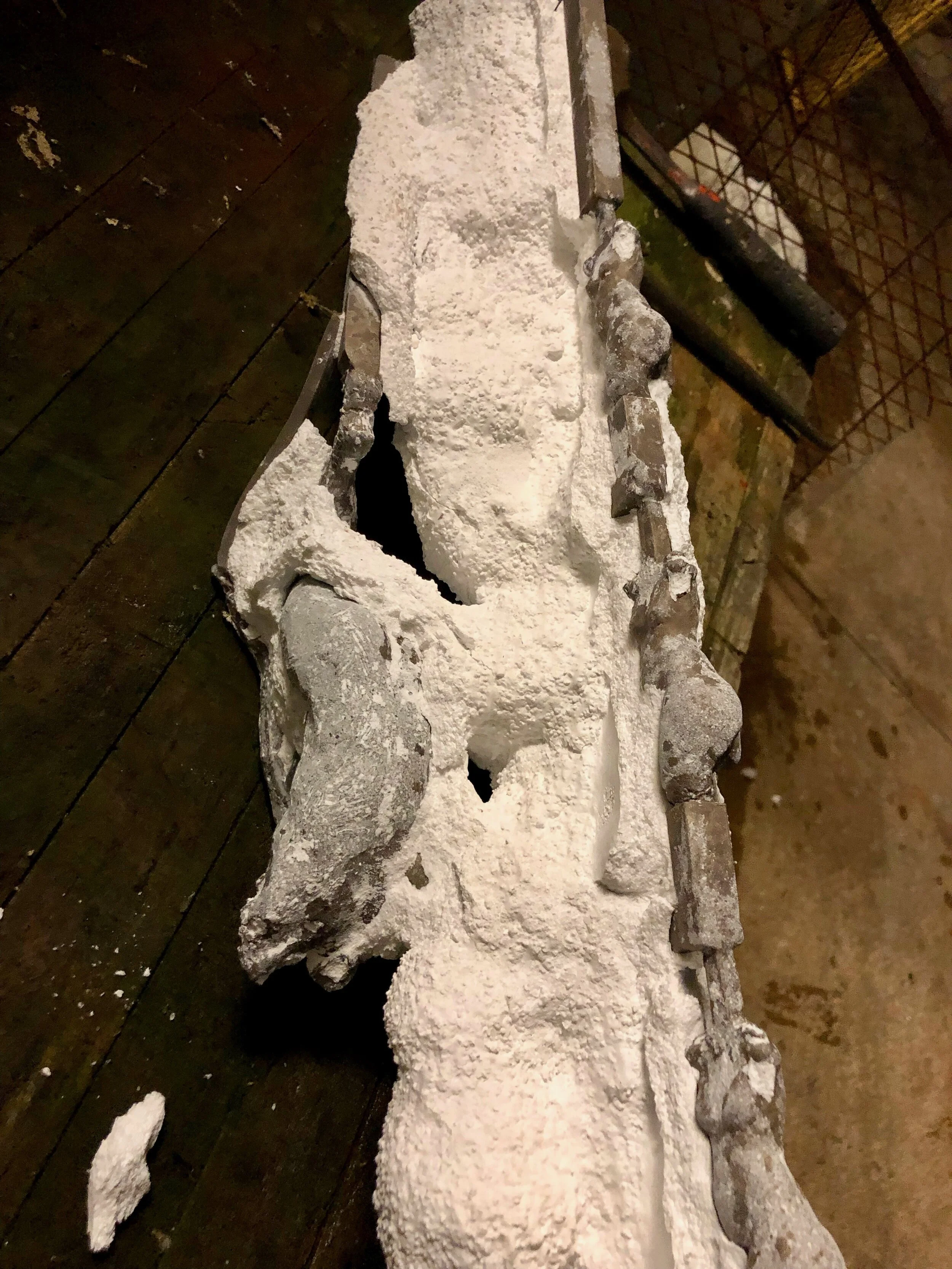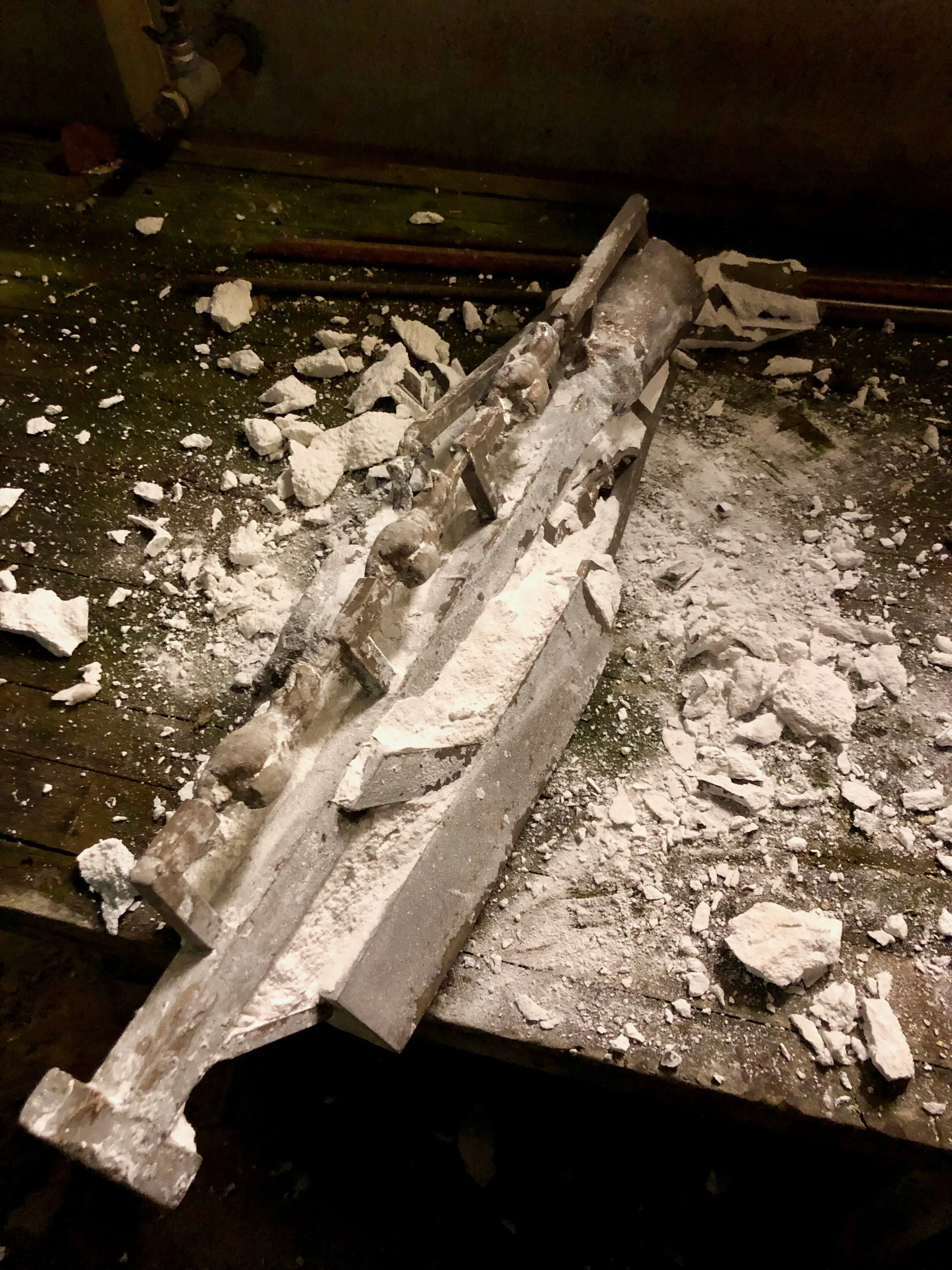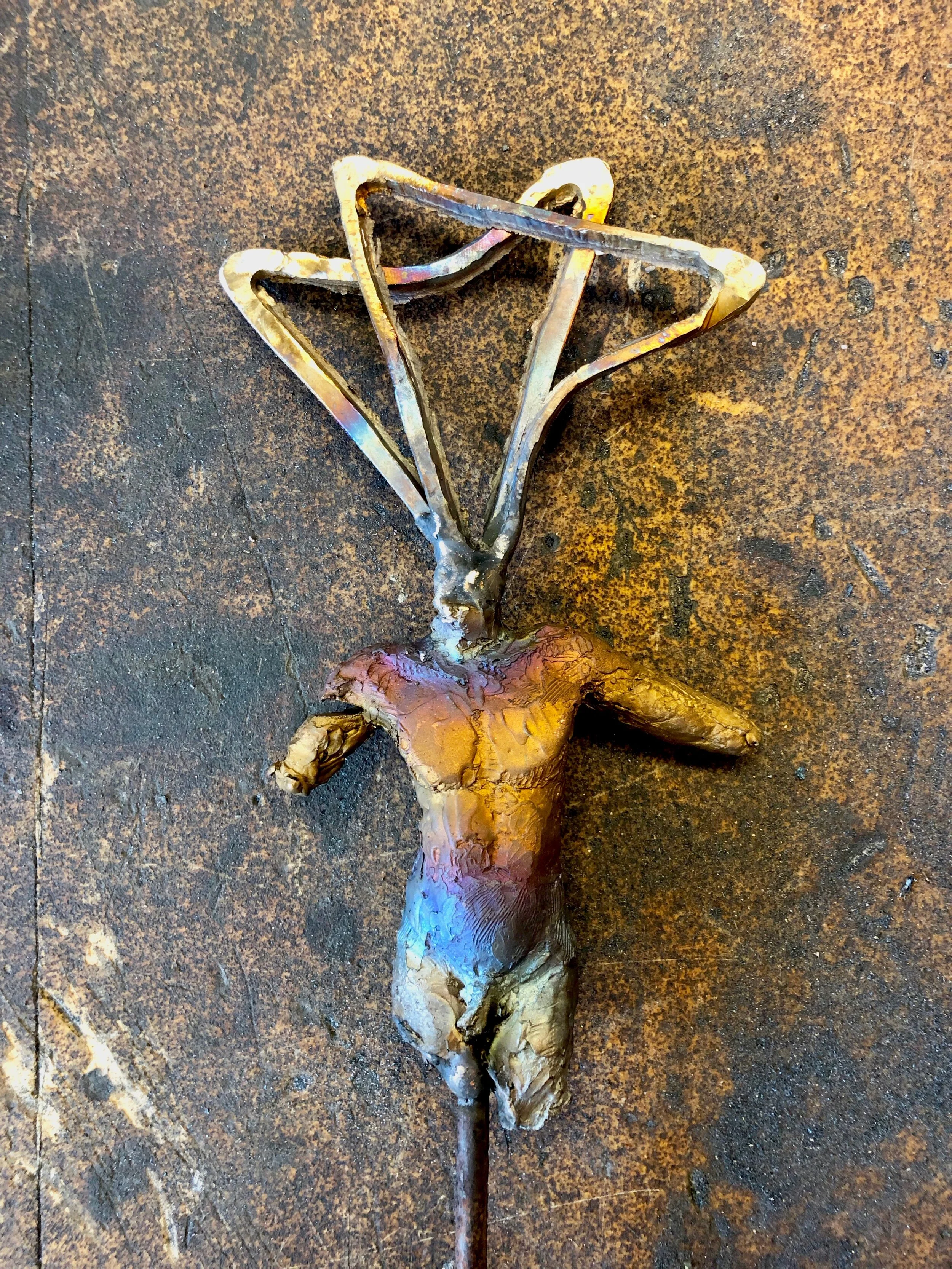 Sprue systems are dipped in silica slurry and covered in silica grit over a period of days, building up the silica to form a shell around the wax. This system is then fired, melting out the wax and producing a hard ceramic shell mould. The shells are then filled with molten bronze and left to cool. Once cool, the ceramic shells are removed from the cast bronze with chisels, hammers and sandblasters. The sculptures are then cut from the remaining bronze sprue system and are chased with metal working tools to hide signs of the sprue system and to fix blemishes. When sculptures have been chased and assembled to the satisfaction of the artist, they are finished with a patina which is made from layering chemicals on the surface of the bronze at different temperatures.